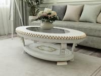 Журнальный (Чайный) столик изготовлен из древесины дуба в тепло-коричневом оттенке. Фигурная столешница с красивым резным ободком декорирована маркетри из нескольких видов прикорневого шпона дуба и ясеня. Столик имеет волнистый резной фриз, отделанный патиной.