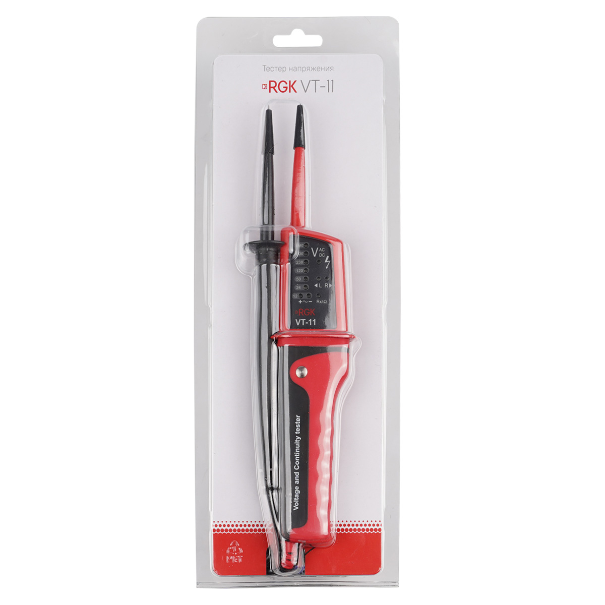 Цифровой тестер напряжения RGK VT-11 - это компактный и удобный в работе прибор, который позволяет быстро определить наличие тока в проводнике, цепи или розетке, а также примерно оценить величину напряжения в диапазоне от 12 до 690 В. Оборудование такого типа чаще всего применяется при ремонте бытовых электросетей, систем освещения и различной электроники.