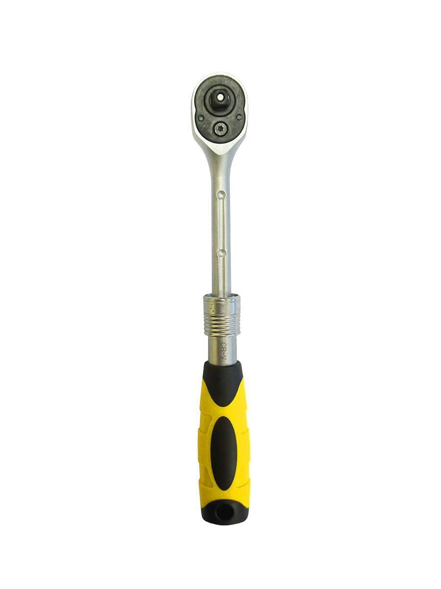 Телескопическая трещотка с возможностью промежуточной фиксации в 3-ех положениях длины рукоятки (примерный шаг составляет 25 мм). Благодаря телескопическому удлинителю, трещотка позволяет снизить усилие при работе с крепежом, имеющий высокий момент фиксации. Шестерня с 72 зубцами, позволит использовать трещотку в ограниченном пространстве, так как угол перестановки рукоятки равен 5 градусов. Тип стали инструмента: CR-V (хром-ванадий) Рукоятка двухкомпонентная резино-пластиковая, стойкая к химическим составам Шестерня с присоединительным квадратом из хром-молибденового сплава (CR-Mo) Привод: 1/4 Размер: 150-200 мм Количество зубьев: 72.