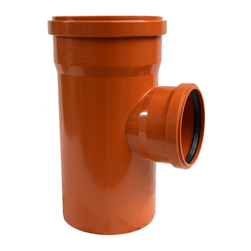 Тройник наружный d=160х110мм 87°. СИНИКОН. Изготовлен из непластифицированного ПВХ (НПВХ). Предназначен для прокладки наружных самотечных канализационных систем.Материал обладает высокой жесткостью. Класс жесткости SN4. Стойкость к кислотам и щелочам. Высокая твердость и формоустойчивость. Соединение труб рассчитаны на давление 0,5 бар при температуре 20°С. Температура сточных вод до 60°С. Химическая устойчивость труб и фасонных частей и уплотнений сохраняется для сточных вод со значением рН 2-12. Однолепестковые уплотнения из SBR резины. Способ соединения – раструбное. Простота и удобство монтажа без специальных инструментов и приспособлений.