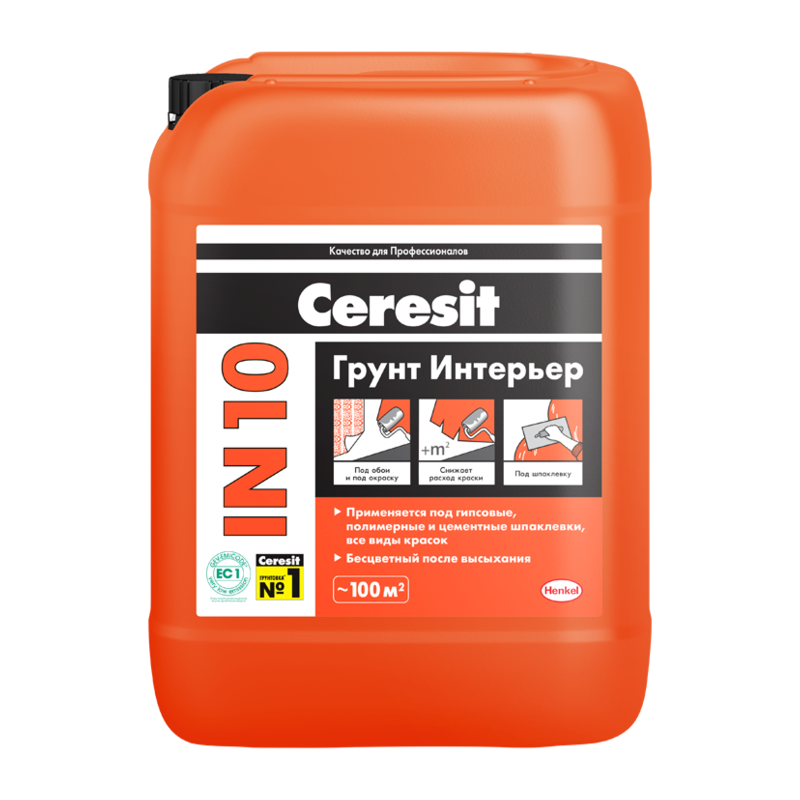 Интерьерная грунтовка Ceresit IN 10 предназначена исключительно для внутренних работ и может использоваться для обработки и подготовки к финишной отделке любого основания впитывающего типа. Расход: 0,1—0,2 л/м² Время высыхания: 2—4 часа.