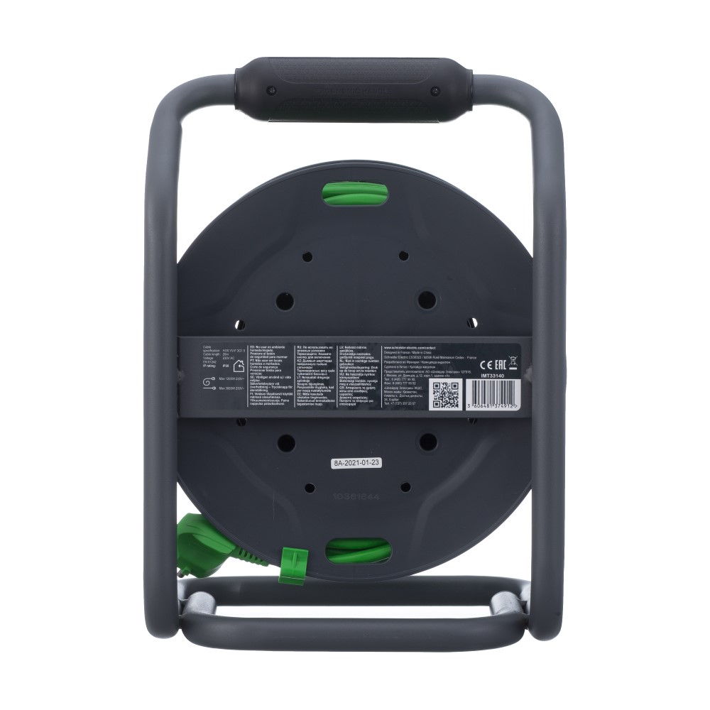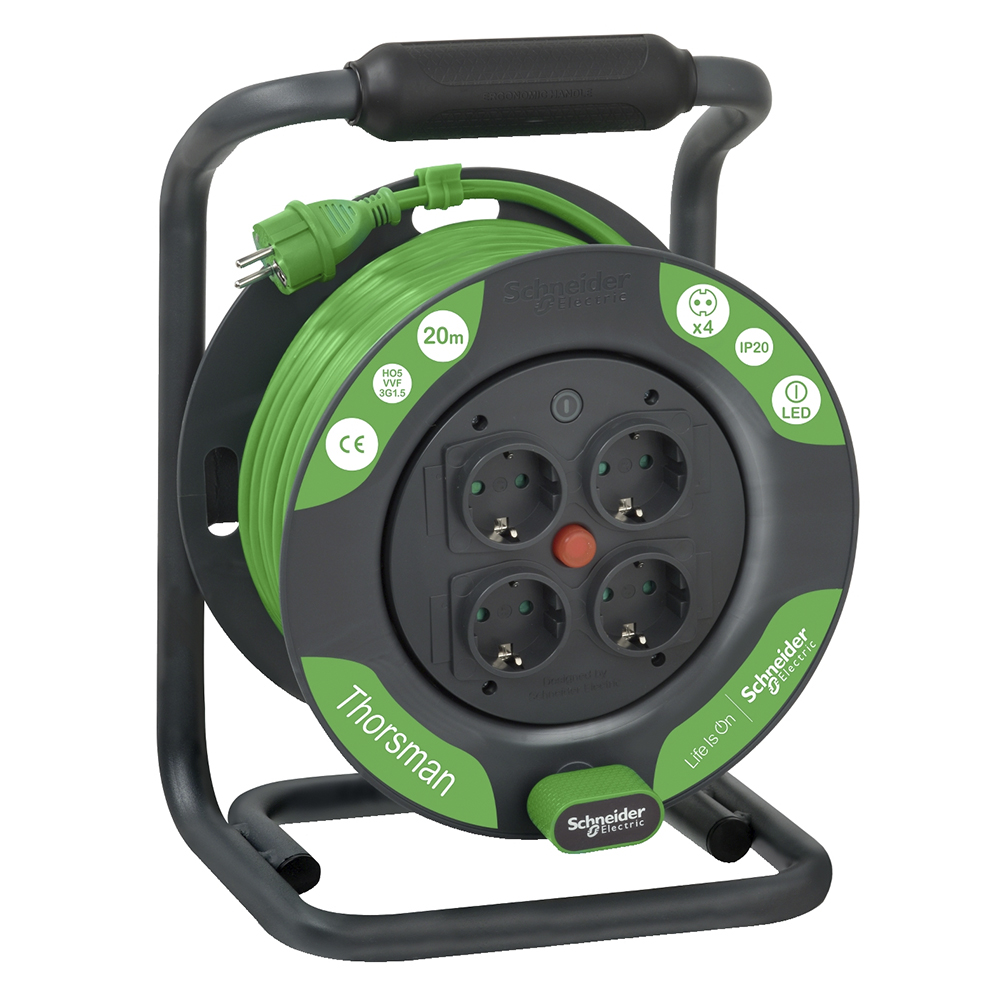Переносной удлинитель Schneider Electric (Шнайдер Электрик) IMT33140 имеет четыре розетки с заземлением, что дает возможность одновременного подключения нескольких устройств. Допускается использование как внутри, так и снаружи помещений. Преимущества: - бобина выполнена из ударопрочного термостойкого пластика; - зафиксированный барабан исключает спутывание провода при использовании и хранении; - светодиодный индикатор для отображения включения и выключения работы изделия; - предусмотрен держатель провода для предотвращения разматывания катушки; - надежная конструкция каркаса обеспечивает устойчивость переносного удлинителя; - обрезиненная рукоять гарантирует надежный захват, при перемещении катушки; - трехжильный провод с сечением 1,5 мм2, высокопроизводительный ПВС кабель HO7 RNF. Характеристики: - размеры, в мм: ширина - 352, высота - 260, глубина - 192; - номинальное напряжение: 220 В; - рабочая температура: от -30 до +50°С. Производитель рекомендует перед включением в сеть полностью разматывать провод.
