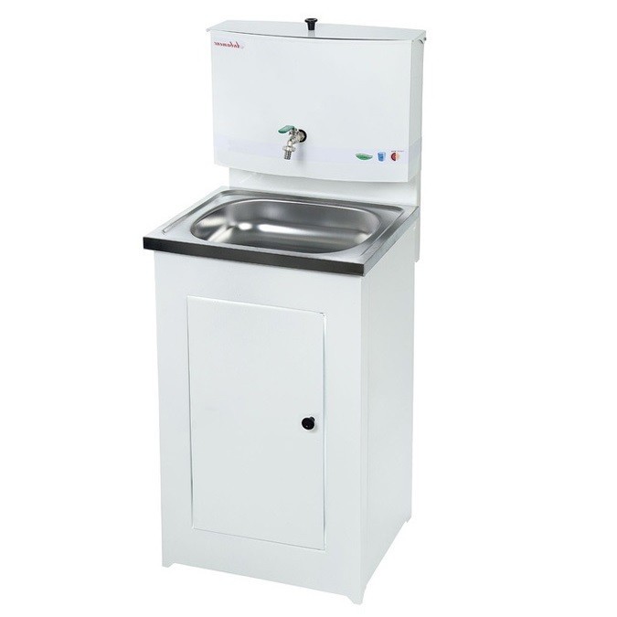 Умывальник Акватекс незаменим для усадьбы, дачи, гаража, мастерской и других мест, где нет центрального водопровода и канализации. Современный дизайн позволит умывальнику прекрасно вписаться в любой интерьер. Умывальник выполнен из высококачественной стали 0,7 мм и окрашен прочной краской белого цвета. Конструкция умывальника сборная, состоит из тумбы, которая незаметно скрывает способ отлива воды и позволяет производить отвод воды даже в канализацию, и бака со специальным краном для экономии воды. Данная модель укомплектована нержавеющей мойкой. Объем бака составляет 20 л. Бак изнутри обработан гальваническим цинковым покрытием, которое обеспечивает долговечность изделия и исключает появление ржавчины. Преимущества умывальника Акватекс: Гальваническое цинковое покрытие бака (новая технология). Продукция сертифицирована. Металлический шаровый кран. Усиленная стойка бака. Отсутствие петель (источник появления коррозии). Тумба на ножках (циркуляция воздуха под тумбой сохраняет ЛКП от преждевременной коррозии). Увеличенная дверца тумбы (для удобства выемки отливной тары). Увеличенная высота тумбы. Коробка евростандарта с ручками (удобство транспортировки).