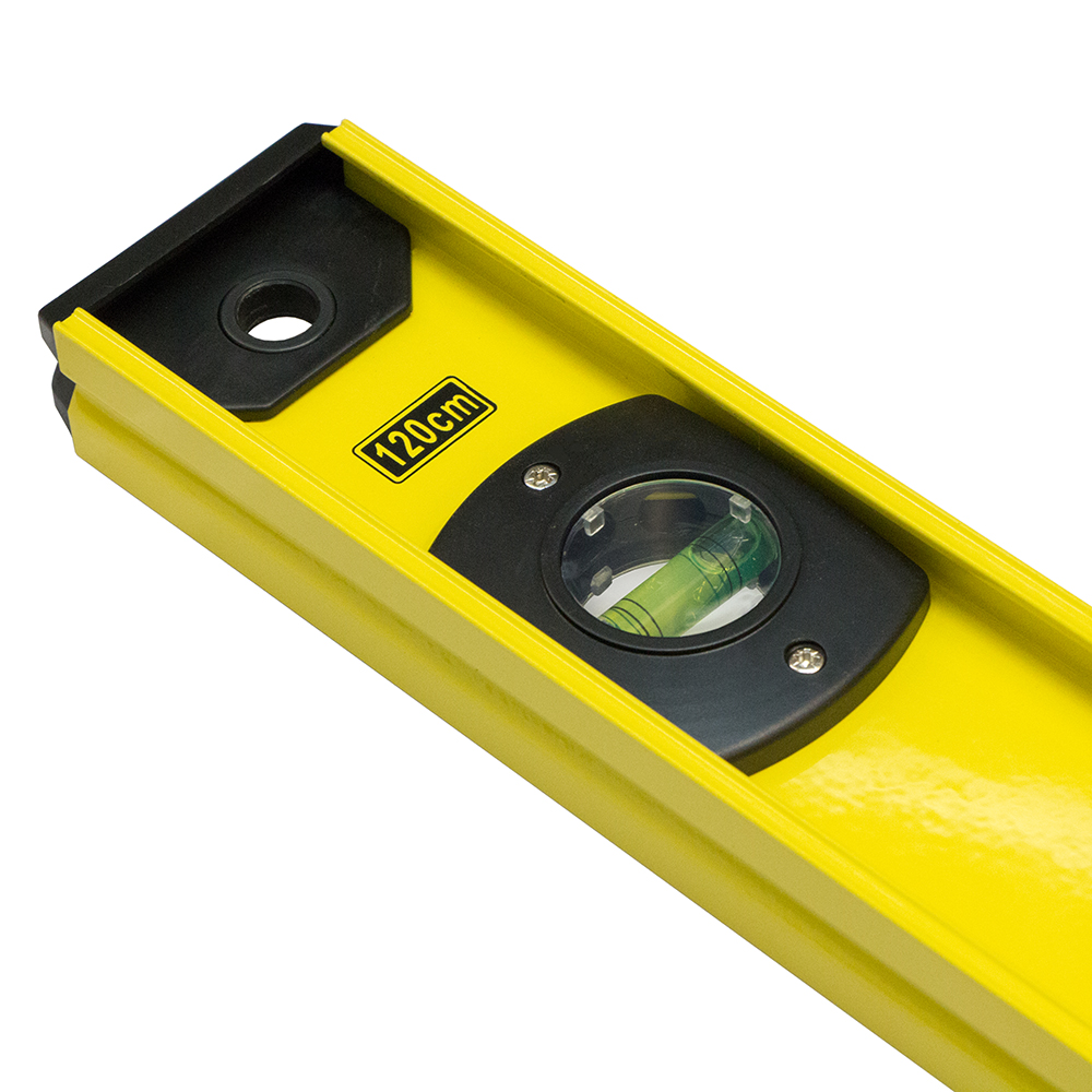Строительный уровень 120 см имеет усиленный двутавровый профиль толщиной 1,9 мм до покраски. Инструмент оснащен V-образным углублением в одной измерительной поверхности для работы с трубами. Материал корпуса выполнен из алюминия и отличается надежностью, долговечностью и легкостью. Имеет 3 цилиндрические колбы с точностью 1 мм/м.