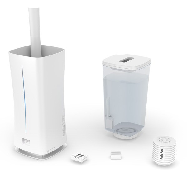 Внешний вид увлажнителя Eva little – это очередной весомый результат совместной работы дизайнера Матти Уолкера и основателя компании Мартина Штадлера. Лаконичная форма разбавлена женственным изгибом, а технологичный шик создается маленьким цифровым дисплеем (отображается текущая влажность). Стройность фигуры подчеркнута вертикальной полоской фирменного голубого цвета, отражающей уровень воды в резервуаре. Она же покажет, что вода закончилась, сменив цвет на красный.