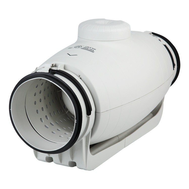 Вентилятор S&P TD-1000/200 Silent с диагональными лопатками изготовлен из прочного пластика. Внутренний перфорированный корпус специальной конструкции и слой шумопоглощающего материала, значительно снижают уровень шума от вентилятора. Вентилятор комплектуется монтажным кронштейном с быстроразъемными хомутами, что позволяет извлекать корпус вентилятора для обслуживания, без демонтажа воздуховодов. На корпусе вентилятора установлена клеммная коробка. Электродвигатель: двухскоростной, 1ф-230 Вт, класс защиты IP44, класс изоляции В, имеет возможность регулирования скорости напряжением. Вентиляторы серии TD разработаны специально для работы с каналами большой протяженности и в условиях повышенных требований к уровню шума в помещении. Имеют достоинства центробежных вентиляторов (большое давление на выходе) и преимущества осевых вентиляторов (большой расход воздуха, малые уровень шума и габаритные размеры). Особенности конструкции вентилятора S&P TD-1000/200 Silent: Внутренний перфорированный корпус. Внутрений корпус специальной конструкции преломляет звуковые волны под определенным углом и направляет их на слой шумопоглощающего материала. Слой шумопоглощающего материала. Звуковые волны, проходящие через внутренний корпус вентилятора, гасятся слоем шумопоглощающего материала. Монтажный кронштейн. В местах соединения корпуса вентилятора и монтажного кронштейна используется материал, препятствующий передаче вибраций.