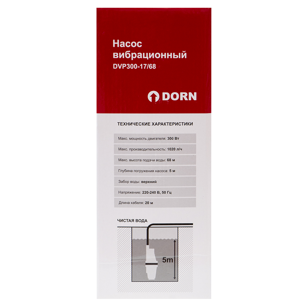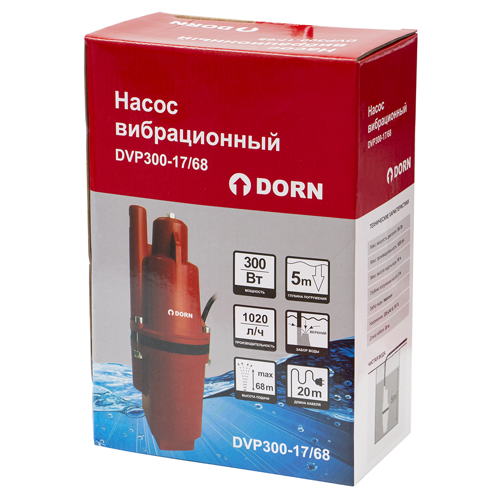 Вибрационный насос DORN 300 Вт, 1020 л/час, напор 68 м, кабель 20 м