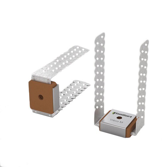 Виброподвес универсальный Soundguard Vibro M представляет собой тонкий виброподвес для стен и потолка на основе эластомера. Универсальный виброподвес разработан специально для экономии пространства при каркасной звукоизоляции стен и потолка. Совместим со всеми профильными системами Knauf для обшивки стен и потолка. Применяется для виброразвязки металлического каркаса в звукоизоляционных конструкциях потолков и стен, для эффективного снижения передачи структурных и ударных шумов. Важно: На потолке данный вид подвесов применяется только с двухуровневой системой металлического каркаса. Относ: от 12 до 130 мм. Состав: оцинкованная сталь толщиной 1 мм, каучуковый эластомер. Преимущества виброподвеса Soundguard Vibro M: Высокая виброакустическая эффективность при малой толщине. Легкость монтажа и экономичность. Эффективная виброразвязка со строительной конструкцией. Отсутствие усадки в течении всего периода эксплуатации. Био- и влагоустойчивость.