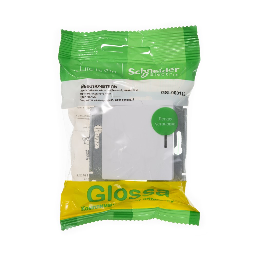 Электрический выключатель Glossa Schneider Electric (Глосса Шнайдер Электрик) GSL000113 скрытой установки снабжен подсветкой, которая позволяет легко ориентироваться в темноте. Данный вид выключателя, без рамки, позволяет установить его совместно с другими розетками или выключателями данной модели под одну совместную рамку, которая приобретается отдельно. Преимущества: Удобный, быстрый и надежный монтаж: - монтажные лапки плотно прижаты к корпусу и облегчают монтаж - простота установки многопостовых комбинаций - телескопическая система выравнивания на неровных стенах - пластиковый механизм выполнен из термостойких электротехнических композитных материалов - 40 000 циклов для выключателей Токоведущие части механизмов закрыты пластиком, поэтому исключается поражение электрическим током. Наличие на основании выключателей схемы монтажа, характеристик изделия позволяют исключить ошибки установки. Номинальный ток: 10А Номинальное напряжение: 220В