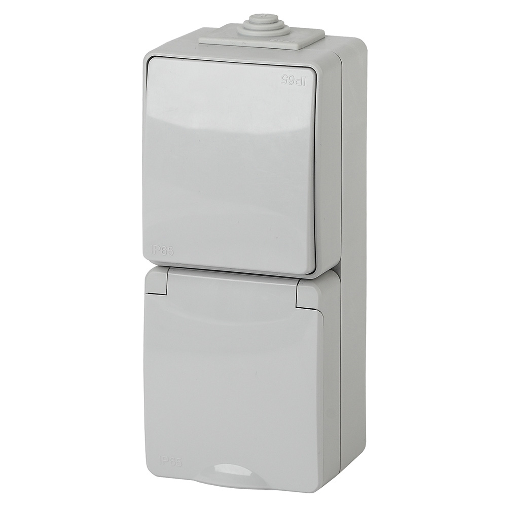 Выключатель с розеткой для управления светильниками и для подключения электроприбора. Защищен от пыли и струй воды.
