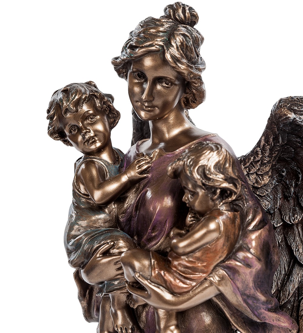 Говорят, что ангел-хранитель спасает тех, кто не подозревает об опасности; в основном о нем вспоминают потом, когда страшное позади. Взрослые люди сознательно идут на риск, а дети не в состоянии оценить риск, так как не обладают ни знаниями, ни жизненным опытом… Христиане полагают, что ангел-хранитель есть у каждого человека, и всегда находится рядом, но не каждый человек дает согласие на помощь. Фигурка «Ангел-хранитель» изображает ангела с двумя маленькими детьми на руках. Судя по лицу, волосам и платью, детей защищает женщина. Трогательная композиция демонстрирует не столько христианские постулаты, сколько материнскую любовь и заботу. Фигурка сделана из полистоуна, и раскрашена в бронзовых тонах. Ее можно использовать для украшения любой комнаты квартиры или коттеджа; фигурка не будет теряться в окружении любых предметов.