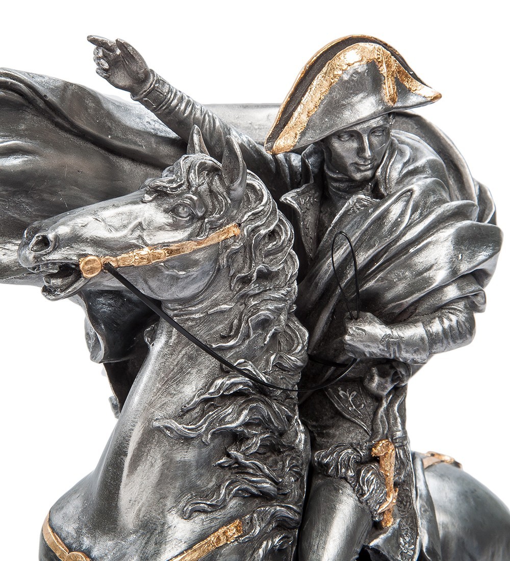 Статуэтка выполнена по картине Жака Луи Давида, французского художника-живописца, "Наполеон на перевале Сен-Бернар" в 1801 году. В период Консульства и Империи Давид получает звание первого живописца императора. Наполеон – одна из самых ярких звезд, которые когда-либо зажигал политический небосвод планеты. О характере необычного полководца, политика и покорителя Европы по сей день спорят историки, разыскивая новые свидетельства жизни этого необычного человека. Как и большинство императоров, Наполеон был тщеславен, и любил, когда талантливые художники и скульпторы создавали его изображения. Статуэтка «Наполеон», сделанная из полистоуна, создана по мотивам картины Жака Луи Давида, изобразившего императора на перевале Сен-Бернар. За проделанную работу, которой Наполеон остался очень доволен, Давид получил звание первого живописца императора Франции. Наполеон изображен верхом на гарцующем коне. Правой рукой он указывает путь вперед; на его голове – вошедшая в легенды треугольная шляпа, а на теле – походный комзол и длинный плащ-накидка. Сбруя коня украшена золотом; позолочены и ножны длинного клинка, висящего на поясе французского полководца. Статуэтка «Наполеон» - хороший подарок для друга с «военным» характером, или для подруги, имеющей «наполеоновские» планы на жизнь. Статуэтка будет хорошо смотреться в большой комнате, кабинете, а также на рабочем месте крупного чиновника или бизнесмена.