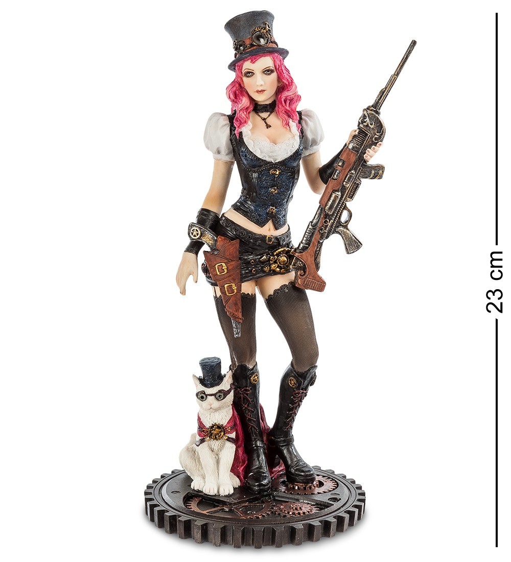 Статуэтка "Девушка" в стиле стимпанк, высотой 23 см. Совершенно очаровательная особа с белоснежной кожей. Привыкла добиваться своей цели во что бы то ни стало. Но лучше всего ей это удается благодаря актерскому таланту. Стимпанк достаточно молодой, но уже довольно популярный вид современного искусства. Научно-фантастическая литература является основной музой этого жанра. Статуэтка девушки является типичным представителем стиля стимпанк. Мастер отлично прочувствовал и воплотил в статуэтке все необходимые атрибуты современного стиля. Головной убор выполнен в виде цилиндра, кофта представляет собой корсет времен викторианской Англии, на ногах чулки с подвязками, а в руках винтовка. Даже кот, которого решил изобразить автор, четко соответствует и дополняет свою хозяйку. Статуэтка в стиле Стимпанк «Девушка» станет замечательным и оригинальным подарком яркой, решительной, необузданной девушке.