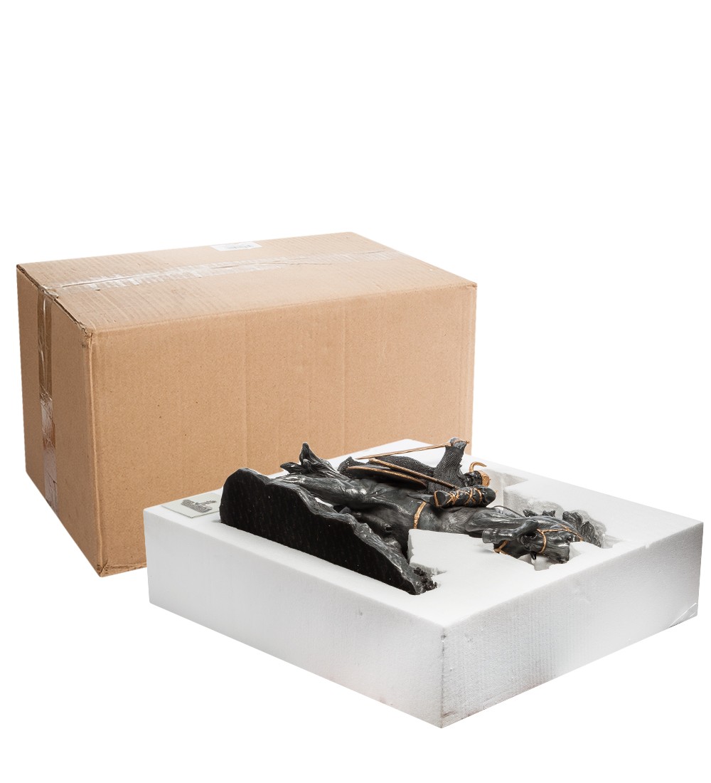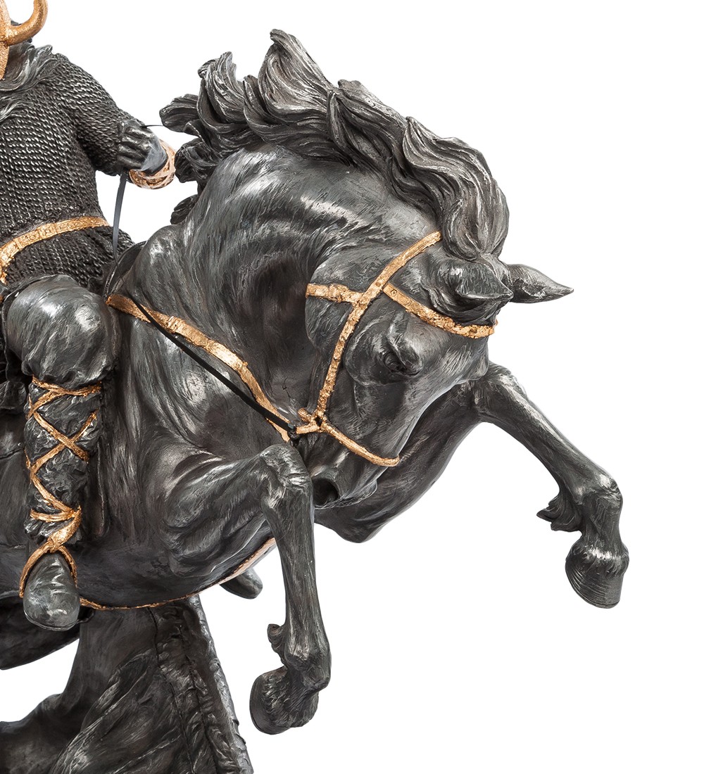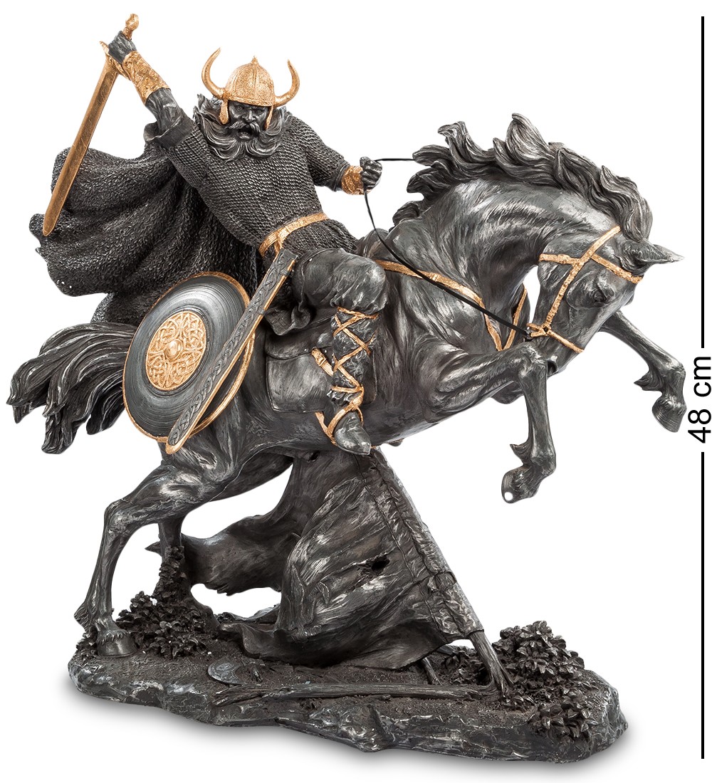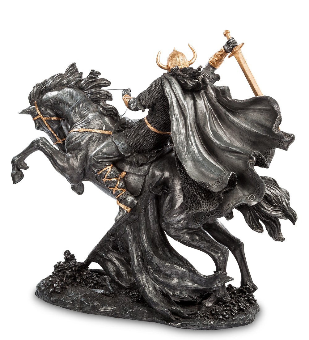 "Тысяча лет назад скандинавские викинги во главе с королем Рагнаром высадились на побережье Англии в надежде захватить вожделенные земли. Движимые жаждой наживы, безжалостные воины опустошали Британские острова, сея смерть и разрушение..." Статуэтка «Викинг» выполнена из полистоуна и имеет внушительные размеры. Фигура викинга получилась очень красивой, словно живая. Основное внимание стоит уделить небольшим деталям, на которые обращает внимание мастер статуэтки. Он выделяет золотым цветом шлем, большой меч, центр щита и пояс. Викинги были в основном свободные крестьяне, которые проживали на территориях нынешней Норвегии и Швеции. Викинги стремились освоить новые территории и, в основном, они были язычниками. Викинги в Англии нападали на англосаксонские королевства с целью грабежа и опустошения монастырей. Это были легендарные воины, которые смогли даже узаконить свои земельные владения в Британии. Статуэтка «Викинга» настолько качественно выполнена, что стоит присмотреться к отдельным элементам. Воин запечатлен в момент нападения и его меч занесен для удара, а верный конь мчится вперёд. Статуэтка Veronese в мельчайших деталях изображает воина и красивого коня. На первый взгляд она кажется очень массивной и тяжелой, но это не так. Несмотря на прекрасное воплощение викинга, фигура весит не более 3 кг.