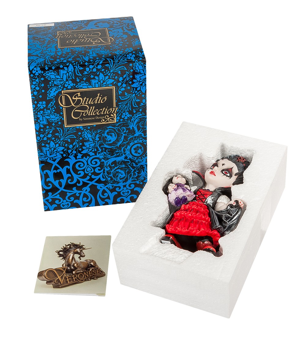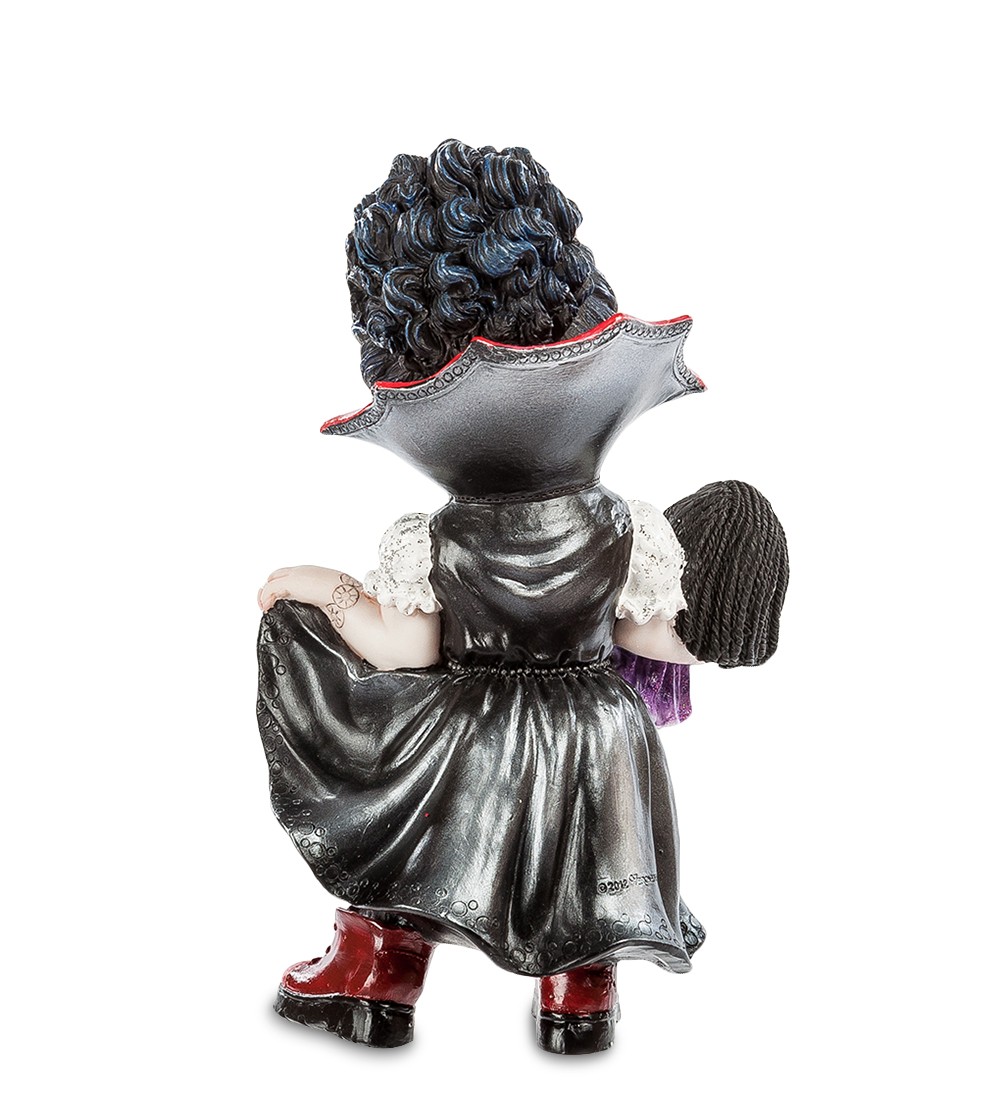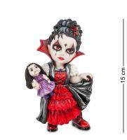 Этот прекрасный ребенок обладает притягательной внешностью, звонким смехом, завораживающим взглядом и ,самое главное, умением превращаться в маленькую летучую мышку. Вам доводилось встречаться с вампиром? Впрочем, встреча с вампиром и поиск подарка обычно не совмещается; вампиры быстро успокаивают своих жертв. О жизни вампиров написано множество книг, снято много лент, а пару столетий назад некоторые ученые посвящали бессмертным кровопийцам научные труды. Мы надеемся и верим, что встречи с настоящим вампиром вам удастся избежать, и предложим неплохую альтернативу – фигурку «Девочка-вампир», созданную в стиле фэнтези. Наша вампирша молода; скорее всего, ей нет и 16-ти. На ней ярко-красное платье и темная накидка с высоким красным воротником, подпоясанная золотой цепочкой. На шее – старинный кулон, а в волосах, заплетенных на старинный манер – красный череп с костями. Не подходи, убьет! В правой руке опасной девочки – верный помощник, длинноволосая кукла в сиреневом платье. Скорее всего, девочка пока лишь грезит романтическими мечтами и никого не покусала.