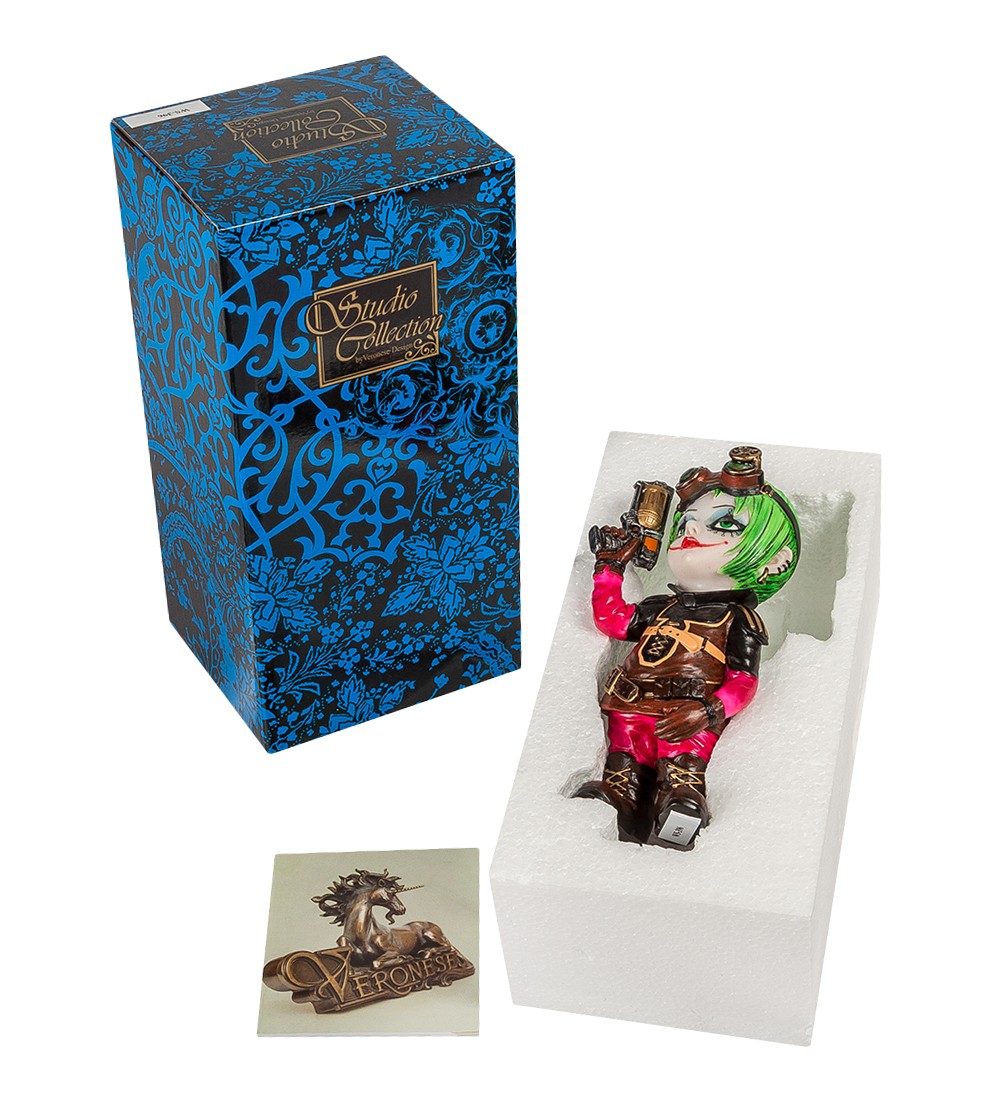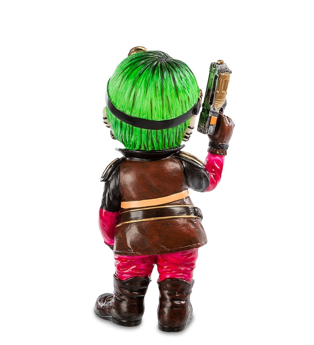 Коварная девчонка с зелеными глазами никогда не расстается с любимой игрушкой - револьвером по имени Джек, она даст фору любому мальчишке. В наше время не существует мужских и женских профессий: представители обоих полов работают поварами, начальниками, медсестрами, шьют одежду и нянчат маленьких детей. Все смешалось в доме Облонских! Статуэтка в стиле фэнтези «Девочка с револьвером» также выбрала исконно мужское занятие – воевать. В стиле одежды явно прослеживается стиль cтимпанк: верхняя одежда героини сделана из кожи, как и прибор ночного наблюдения. У девушки салатовые волосы, эмо-макияж, гармонирующий с цветом волос и одежды, в правой руке - массивный стальной револьвер с золотым барабаном. «Девочку с револьвером» можно подарить девочке-тинейджеру, которая увлекается фэнтези и любит повоевать.