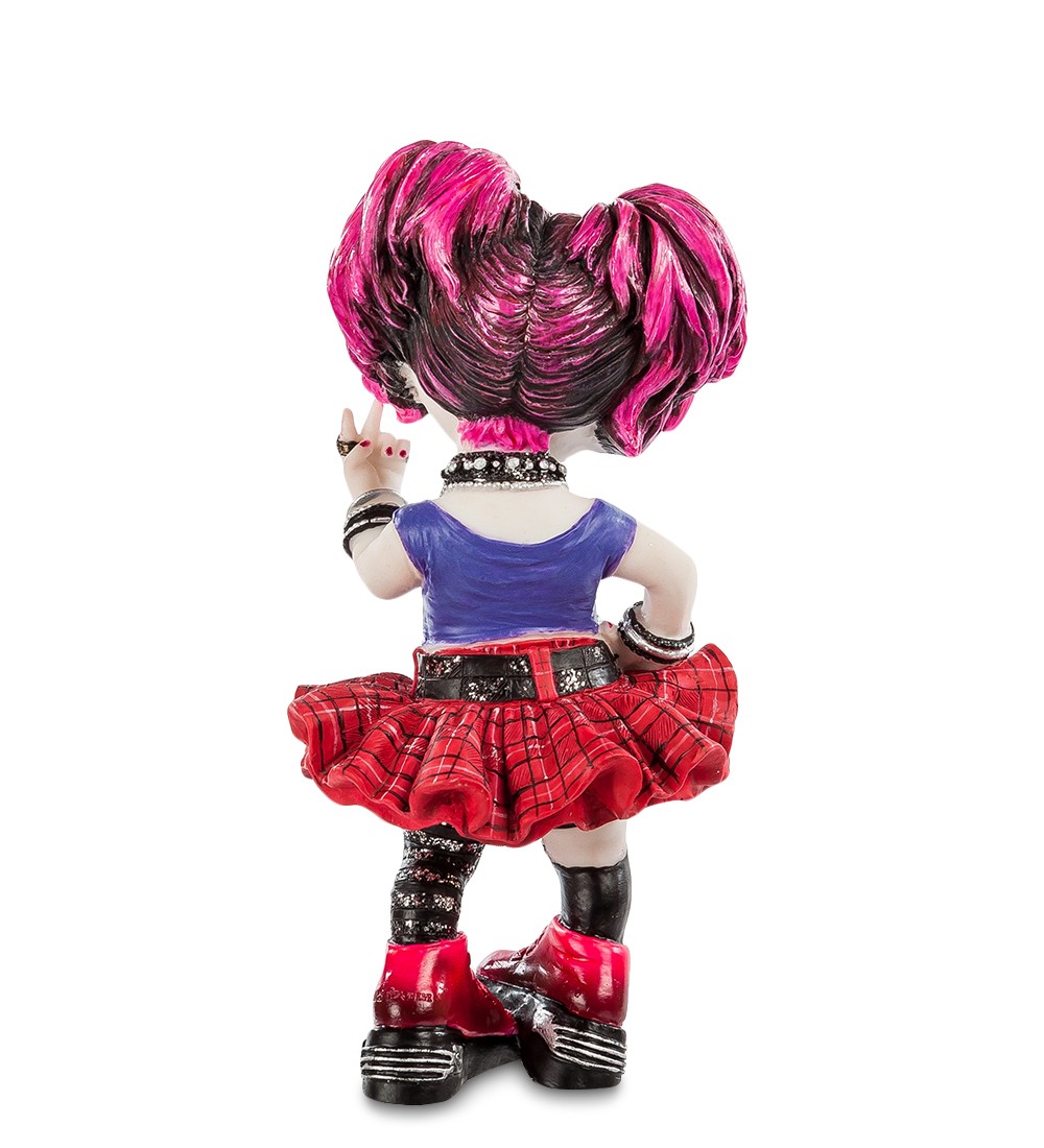 Бабушка этой славной девчушки водит давнюю дружбу с основательницей стиля панк в моде Вивьен Вествуд. Она же в свою очередь балует ее внучку дизайнерской одеждой из последних коллекций. Вы знаете, как выглядит настоящий, классический панк? Жители крупных городов с ними знакомы, а тем, кому не доводилось встречать представителя этой молодежной субкультуры, стоит взглянуть на статуэтку в стиле фэнтези «Девочка-панк». Как и другие панки, на шее у девочки – ошейник с шипами. Иногда их можно встретить и у металлистов, но цепей и длинных, до плеч волос девочка-панк не носит. Забавная стрижка и частично покрашенные в малиновый цвет волосы также являются атрибутом панк-культуры. Необычные браслеты, ярко-красная юбка с широким кожаным поясом, массивные малиновые ботинки, серебряный череп с костями на цепочке, яркий макияж... девочку трудно не заметить. Фигурку можно добавить к игрушкам и статуэткам – в вашей коллекции наверняка нет статуэток-панков. А можно подарить подростку, который пристально следит за молодежной модой и не желает быть похожим на других.