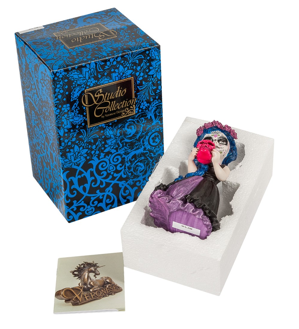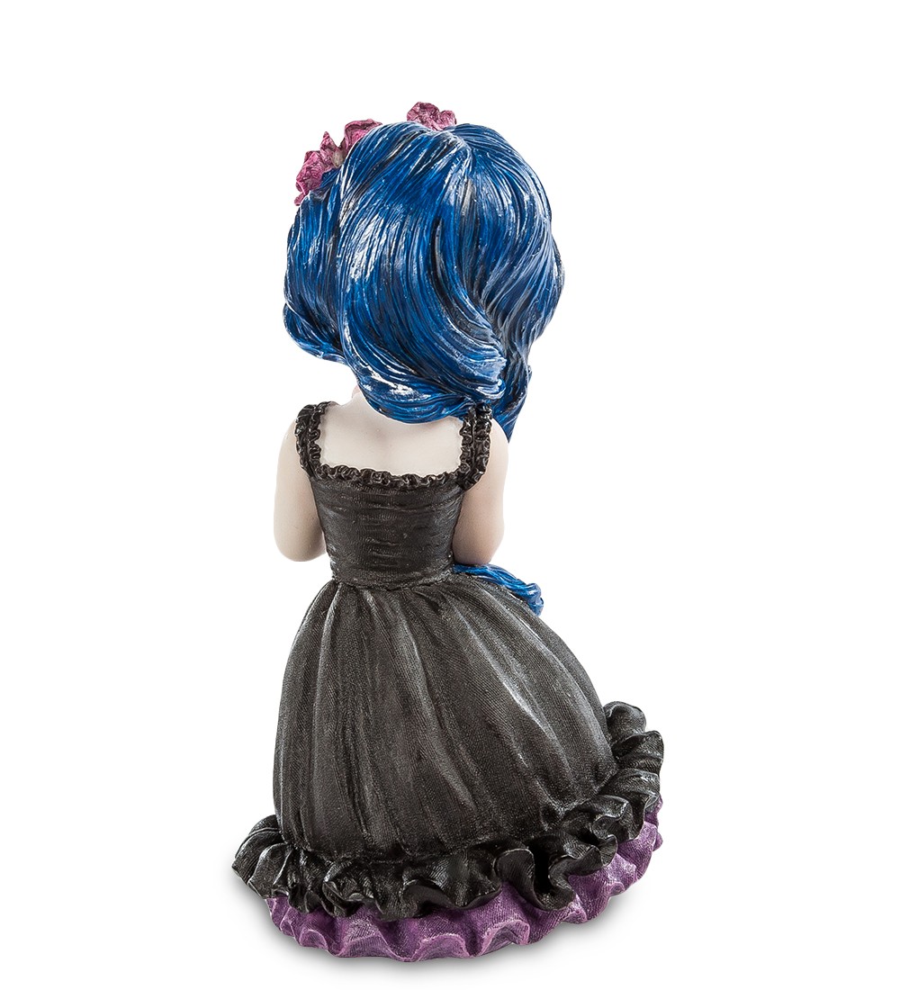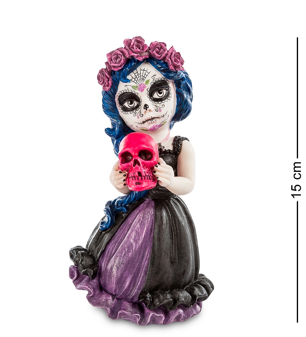 Череп в руках - символ интеллекта и жизненной энергии, предвестник грядущих перемен и постоянный спутник нашей готической красавицы. «Девочка с черепом» в стиле фэнтези – очень смешная статуэтка. У ее автора все в порядке с чувством юмора... а может быть, нам просто захотелось посмеяться? Решать вам: мы расскажем о ней побольше, и вы оцените наши впечатления. Лицо девочки стилизовано под куклу Вуду, но два розовых цветка, на лбу и на подбородке, слегка оживляют заколдованного мертвеца. Ярко-голубые волосы украшены фиолетовыми розами, которые отдаленно напоминают бигуди, и становится понятно, кого она напоминает: именно так выглядит добрая половина женщин по утрам, когда к ним лучше не приближаться. Девочка одета в черно-фиолетовое платье, фасон которого был придуман кутюрье времен королевы Виктории. Черный лак на ногтях гармонирует с вуду-макияжем и платьем, но гвоздь композиции – череп. У черепа нет верхнего переднего зуба, но, если присмотреться к фото, есть глаза, которые решили спрятаться от яркого света в области затылка. Яркий малиновый цвет черепа невозможно объяснить, но с художественной точки зрения малиновый череп – удачная креативная находка. Взглядом девочка чем-то напоминает хозяйку, которая вернулась с кухни, держит в руках горячий чайник, и пытается понять, что обсуждали за столом в ее отсутствие. А может быть, девочка просто следит за вашей реакцией: малиновые черепа встречаются нечасто.