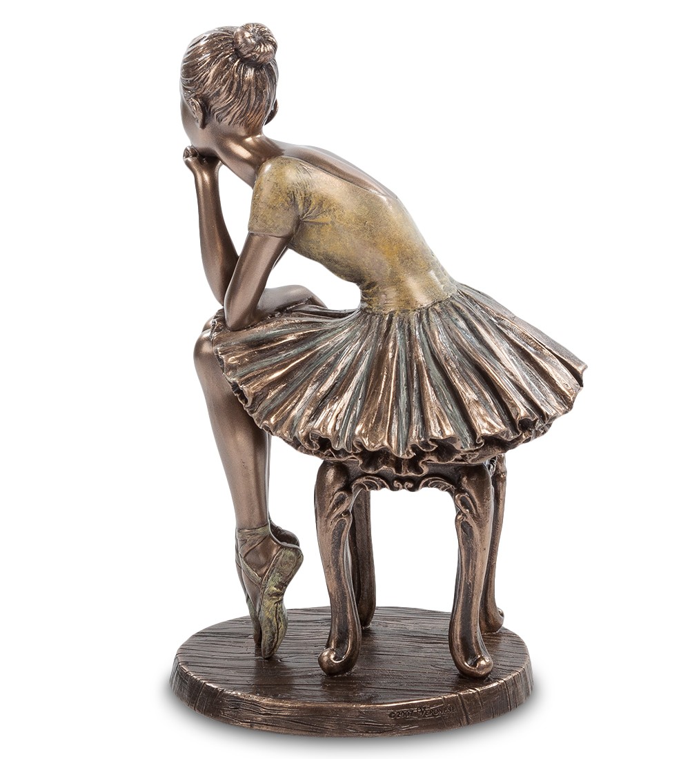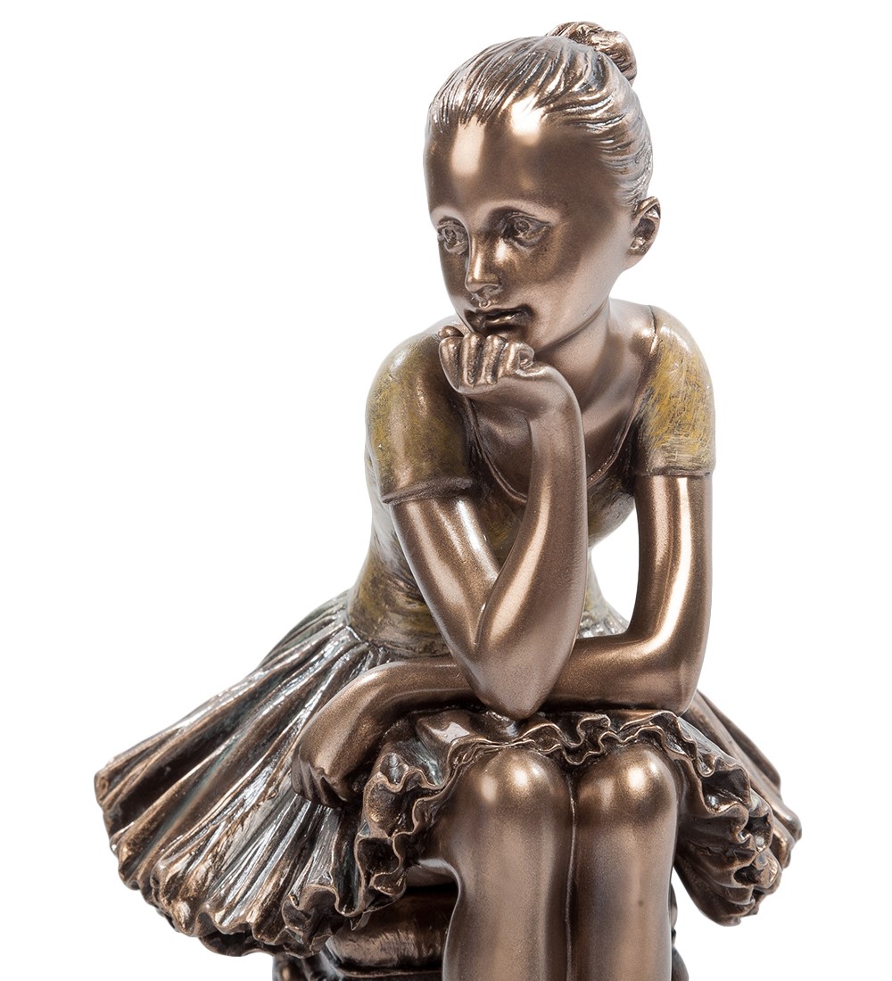 О, волшебное слово "балет"! В памяти всплывают яркие огни, прекрасная музыка, шорох пачек, легкий стук пуант. Открывается занавес, все взгляды устремлены на сцену. И взору открывается великолепное действо -балетные дивы легки и пластичны, и так легко выполняют сложнейшие па. Мари Рамберг, Анна Павлова, Матильда Ксешинская, Галина Уланова, Майя Плисецкая, Екатерина Максимова, Ульяна Лопаткина - это только маленький перечень балерин, прославивших балет. Небольшая статуэтка «Юная балерина» рассказывает о нелегких буднях девочек, решивших посвятить себя большому искусству балета. Хрупкое юное создание скромно пристроилось на старинной табуретке, и мечтательно смотрит вдаль, отдыхая после тренировки и думая о будущем успехе. На девочке классический наряд балерины: пачка, пуанты и легкая футболка. Статуэткой с юной балериной можно украсить книжную полку, особенно если на полке собраны книги об искусстве и каталоги с репродукциями картин великих художников. Ну а если вы в состоянии выдержать взгляд будущей звезды, можете поставить отдыхающую балерину в кабинете, и она будет тихо наблюдать за вашей работой, напоминая присутствием о высокой роли искусства в жизни человека.