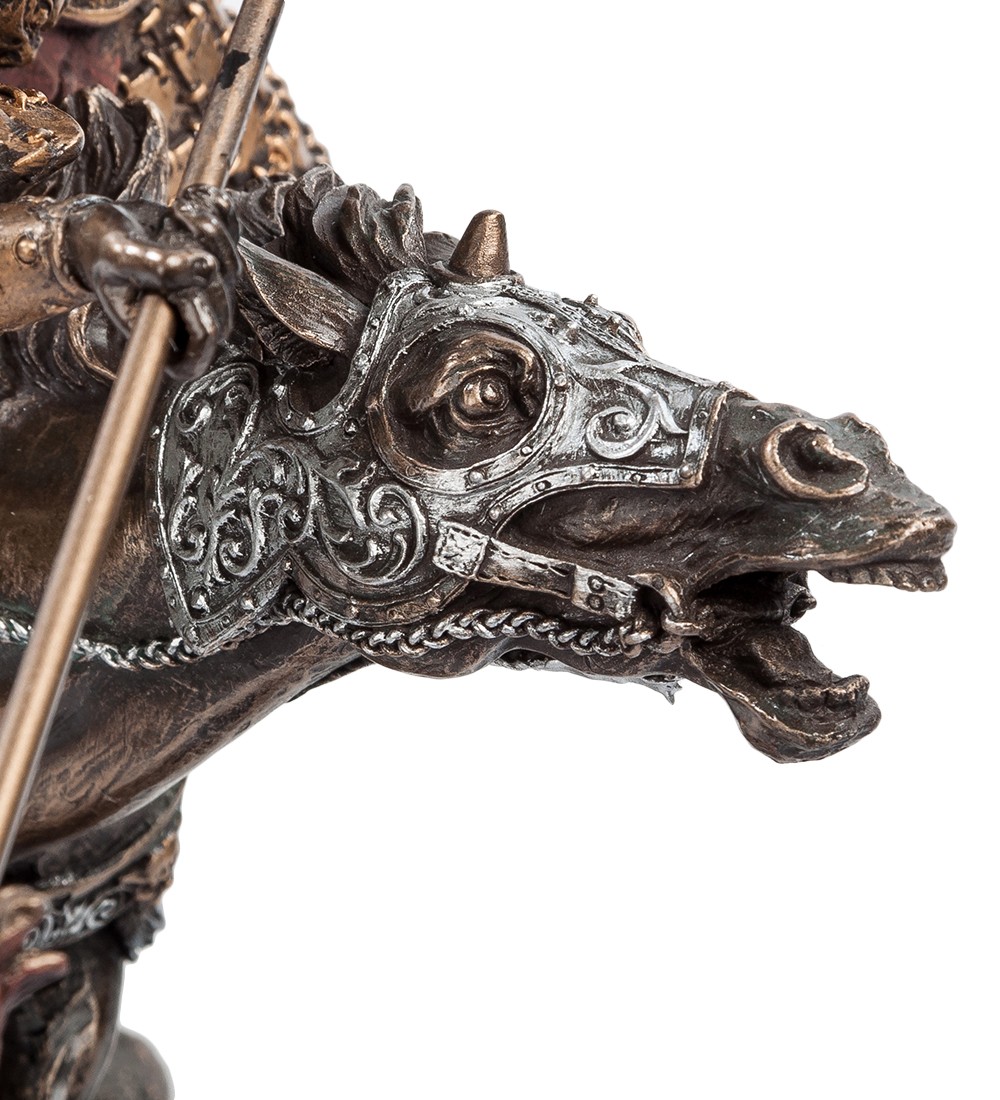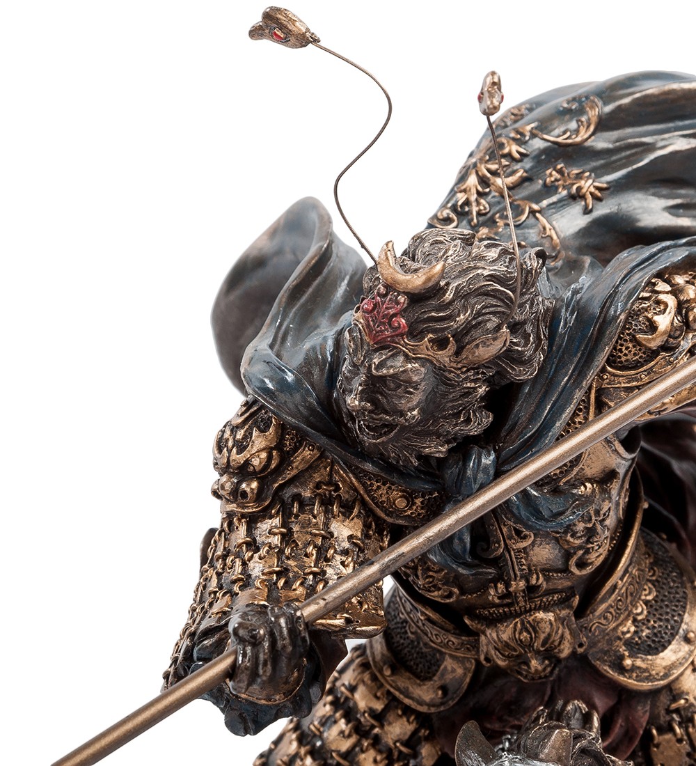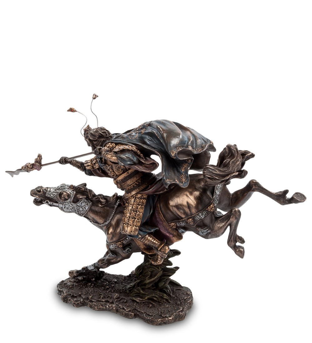 "Настоящий воин сначала побеждает у себя в голове, а потом приходит на битву" - восточная мудрость. О том, как воевали в древности, написано множество романов и снято множество приключенческих кинолент, но писателей и сценаристов чаще интересовали воины, жившие на их родной земле; о том, как в средние века воевал восток, мы почти не знаем. Если история востока вам интересна не меньше, чем история европейского средневековья, взгляните на 26-сантиметровую статуэтку «Китайский воин», сделанную из темного полистоуна. Создатели фигурки полагают, что китайские воины предпочитали воевать в седле; рыцарь Поднебесной скачет по полю битвы на вороном скакуне, морда которого защищена от оружия врага, ноги украшены серебристыми браслетами, а тело опоясано прочным кожаным ремнем со вставками разноцветного металла. В руках у воина копье с необычным наконечником, на шее – синий плащ-накидка, а все тело, от головы до пят, заковано в тяжелые латы. Китайского средневекового всадника можно подарить знакомому офицеру, или презентовать подростку, один за другим глотающему исторические романы о средневековых баталиях.
