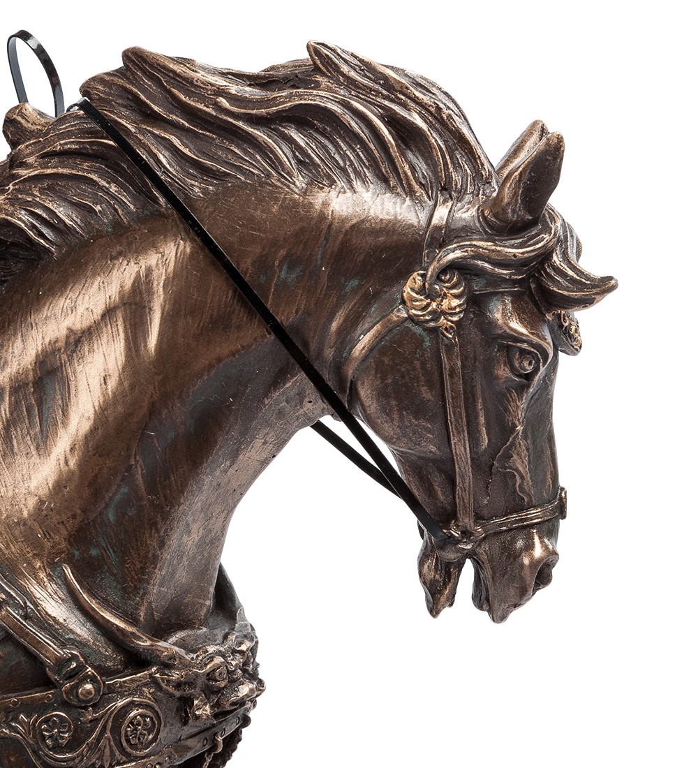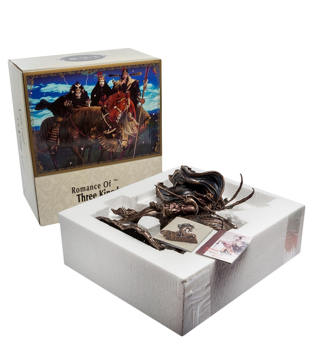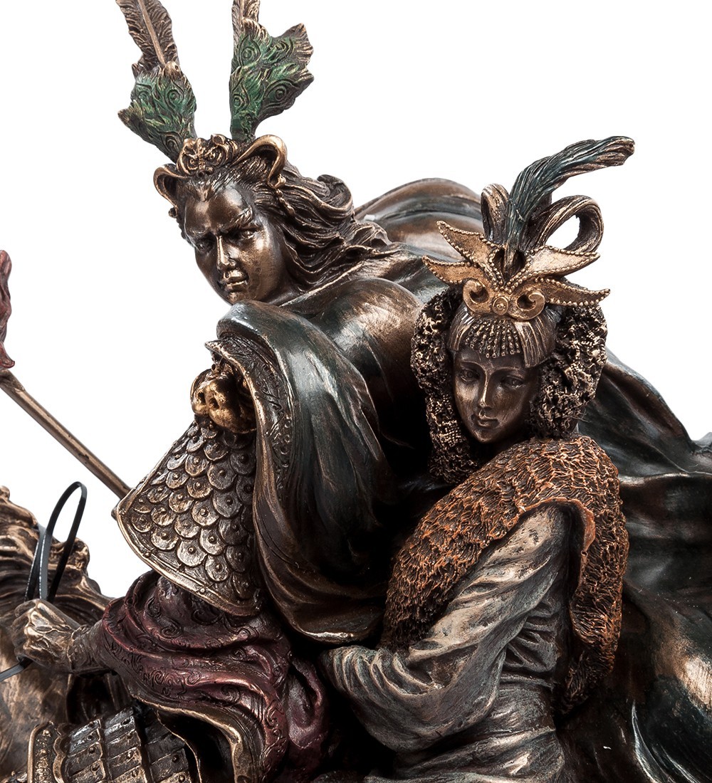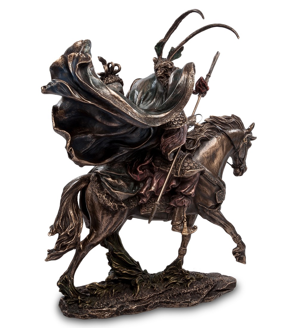 Статуэтка изображает героев романа "Троецарствие", повествующего о событиях эпохи троецарствия в Китае (III век н.э.), когда Поднебесная распалась на три государства: Вэй, Шу и У. Быть воином и передвигаться на коне – так романтично! А если сзади вас находится возлюбленная, романтично вдвойне. К сожалению, в современных войнах кавалерия не участвует, да и возлюбленных, готовых дни напролет скакать по бездорожью, найти непросто. Для тех, кто любит старину и переживает за героев старинных новелл, мы приготовили статуэтку «Воин и его возлюбленная». Фигурка изображает сцену из романа «Троецарствие». В 3-м веке до нашей эры Китай распался на три государства (Вай, Шу и У), и Поднебесную раздирали кровопролитные войны. В войнах принимали участие как регулярные войска, так и наемники. Статуэтка изображает храброго, хорошо экипированного воина на гнедом скакуне, спасающего от опасностей войны любимую девушку. Фигурка окрашена в медный цвет, элементы одежды воина и девушки выделены золотом и оттенками зеленого цвета.