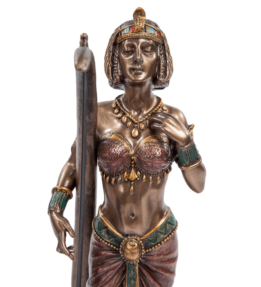 Клеопатра - последняя царица Египта из македонской династии Птолемеев, последний независимый правитель Египта. Уже при жизни стала героиней легенд, известной своей необычайной красотой. Клеопатра – всемирно известная правительница Древнего Египта, последний фараон древнего мира. О ее редкой привлекательности и женской силе ходят легенды, хотя, по понятным причинам, историкам не удалось восстановить ее точный образ: точных средств передачи изображения в Древнем Египте не существовало. Статуэтка из бронзового полистоуна «Клеопатра с лирой» изображает царицу рядом с высоким старинным музыкальным инструментом, напоминающим укороченную арфу. Высокая лира с семью струнами украшена головой кобры; Клеопатра перебирает струны правой рукой, закрыв глаза и погрузившись в мир собственных эмоций и переживаний. На ней головной убор фараона, украшенный золотой коброй, массивное золотое колье, и множество браслетов. Длинную юбку женщины-фараона удерживает на бедрах зеленый пояс с круглой массивной золотой пряжкой. Фигурка высотой 27 сантиметров располагается на плоской квадратной подставке, выполненной в древнеегипетском стиле. Клеопатру с лирой можно преподнести на юбилей женщине-музыканту, подруге с сильным характером, а также женщине, прожившей яркую, необычную жизнь.