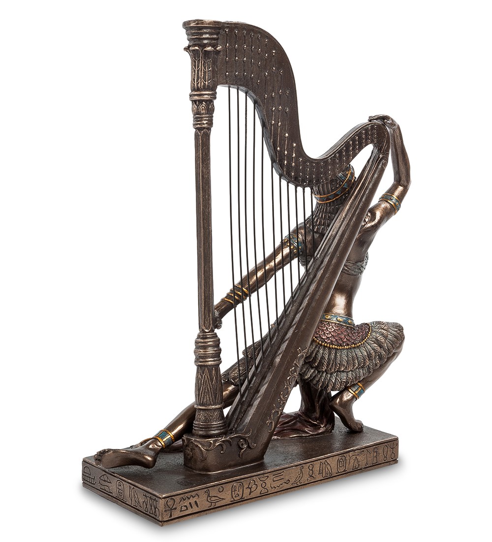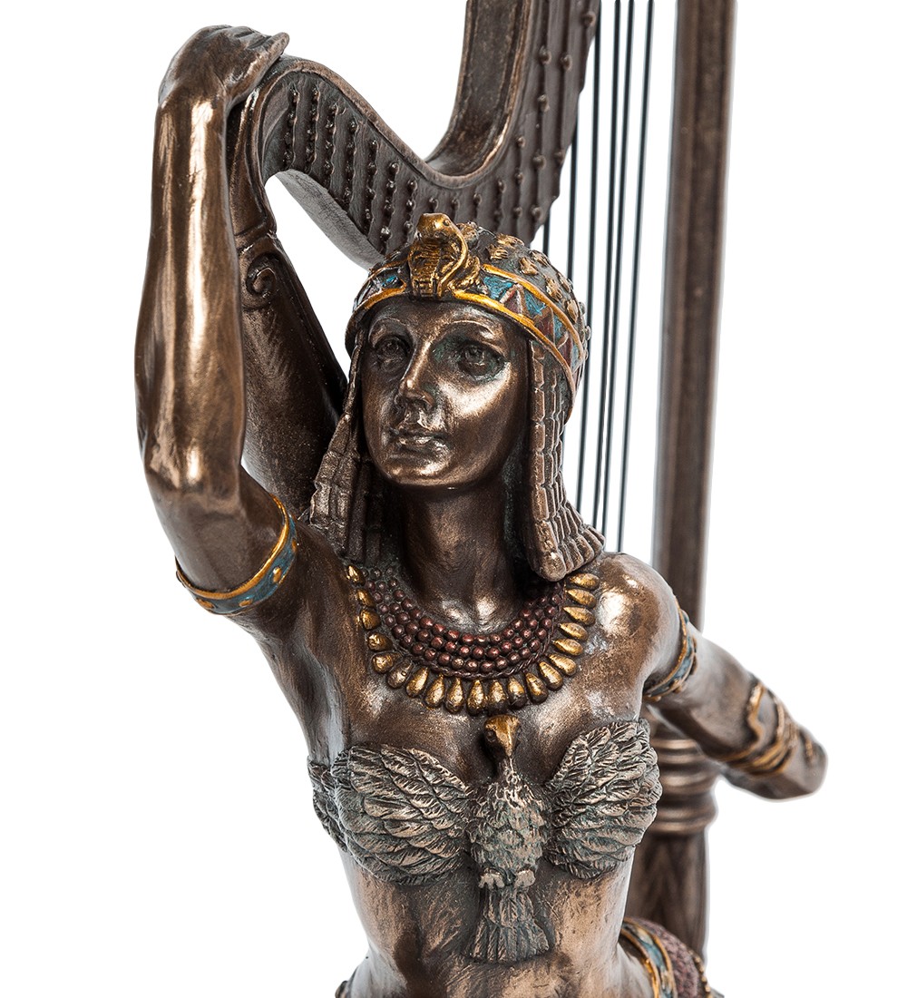 Знатные женщины в Древнем Египте могли стать придворными или жрицами, другие певицами, танцовщицами, музыкантами при царском дворе или в храмах. Культура Египта всегда была предметом пристального интереса. Множество скульптурных композиций создано по мотивам древнегреческих фресок и останков, найденных археологами на местах древних египетских поселений. Египтяне носили необычные, яркие, и в то же время аккуратные, геометрически точные и пропорциональные одеяния. Это отмечено на нашей статуэтке «Египтянка с арфой». На девушке – юбка с красивой выделкой, подол которой сделан из крупных перьев неизвестной птицы. Перья также прикрывают ее грудь, а на ногах и руках – красивые старинные браслеты. Она позирует на фоне старинной арфы - инструмента, который по сей день используется при исполнении симфонической музыки. Скорее всего, египтянка не только владеет искусством игры на арфе, но и неплохая спортсменка: вместе с музыкальным инструментом они составляют красивую, причудливую фигуру. Статуэтка «Египтянка с арфой» понравится многим. Красота девушки порадует глаз молодых мужчин, египетский наряд – культурологов и стиляг, а старинная арфа – любителей музыки.