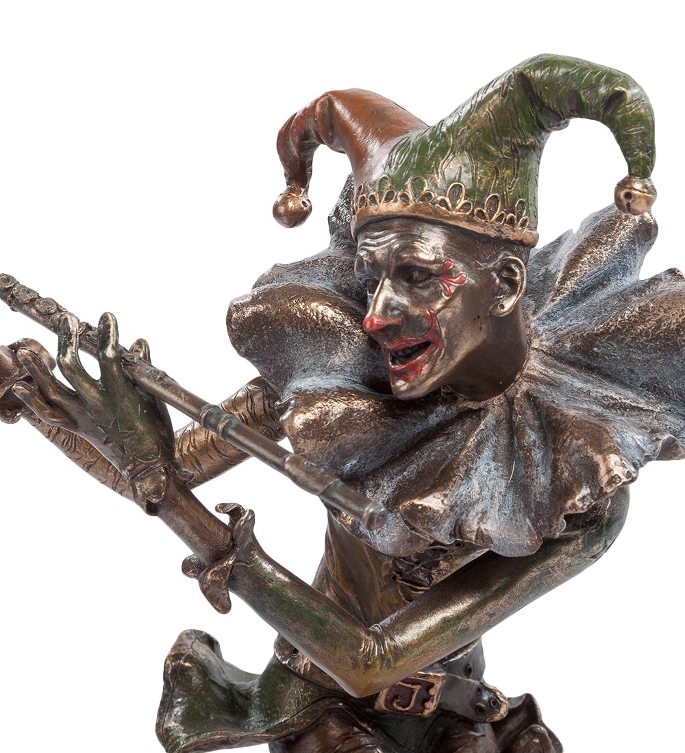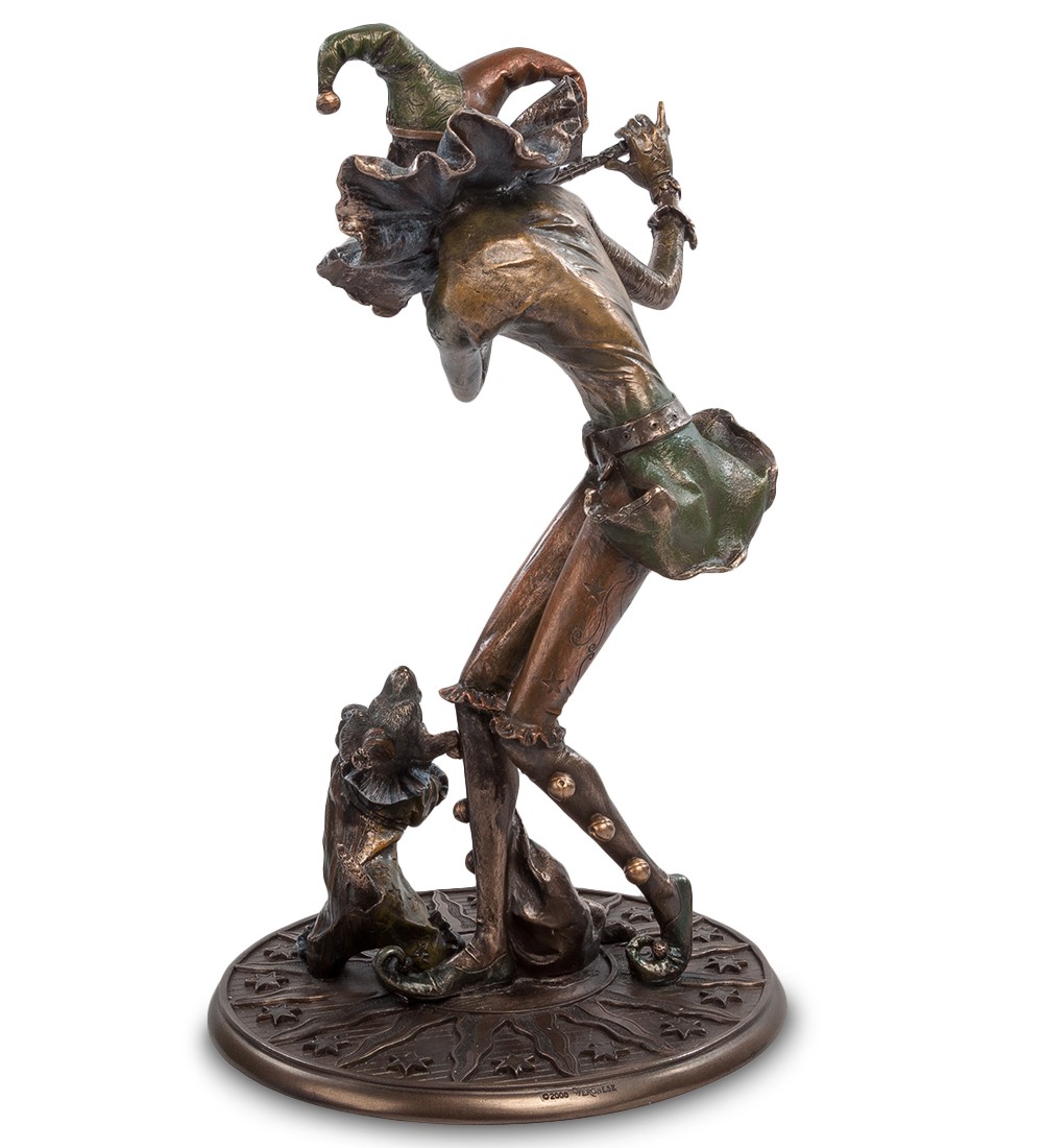 Шут - специальный человек при дворце монарха или дома богатого аристократа. В его обязанности входило развлекать хозяина и его гостей шутками и забавными выходками. Зачастую шуты могли открыто критиковать своих хозяев. Шут – приближенный короля, чудаческая особа, которой было позволено насмехаться над придворными, пародировать даже самого правителя и членов его семейства – все ради того, чтобы его святейшеству было весело и задорно. Шуты пользовались большими привилегиями, но в то же время были сущими марионетками. Их жизнь зависела от настроения короля. Неправильная шутка могла стоить головы. Статуэтка «Шут» из качественного полистоуна изображает худощавого шута, держащего в руках флейту и наигрывающего мелодию для зевак. У ног весельчака примостился пес, задорно подняв голову на своего хозяина. Хитрое лицо шута выражает всю сущность этого персонажа в его эпоху – лукавость и двуличие, приправленные осторожностью и предусмотрительностью. От шута нужно было мало – веселить короля. Но те методы, которые выбирал шут, определяли его положение при дворе и расположение к нему правителя. Купить фигурку шута - купить атмосферу праздника и веселья в свой дом. Ваши гости и друзья не пройдут мимо такого замечательного творения, которое дарит улыбку и поднимает настроение.