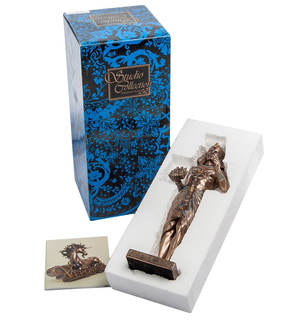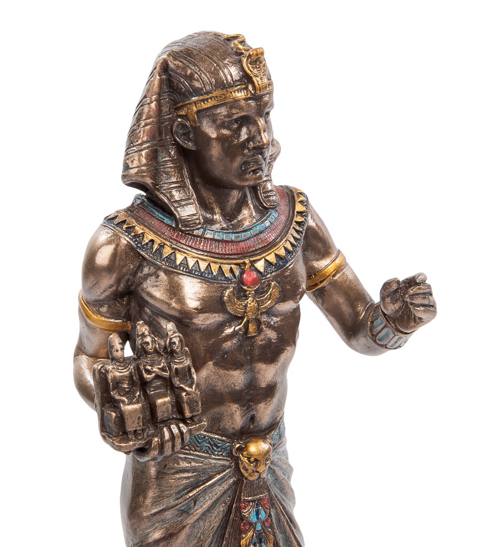 В Древнем Египте вершиной общества и действующей религии был фараон. Он был верховным военачальником и верховным жрецом каждого бога в царстве. Благодаря его отношениям с богами, ему было поручено сохранение порядка, или Маат Земли, и, следовательно, удерживать хаос, часто возникающий в виде врагов Египта из чужих земель. Мы многое узнали о фараонах, когда археологи познакомили нас с культурой Древнего Египта. Огромные старинные пирамиды, в которых правители древней страны находили свои пристанища, до сих пор удивляют ученых. Фараону приходилось овладевать многими способностями: многие из них были прекрасными полководцами, а некоторые известны тягой к знаниям, магии и таинственным обрядам, которые были призваны усилить их власть на Земле и помочь благополучно отправиться в загробный мир после смерти. Фигурка «Фараон», сделанная из полистоуна, изображает одного из правителей Древнего Египта в красивом античном одеянии. На его голове – платок в золотом обруче, украшенном коброй, на груди – большой разноцветный воротник, а в руках – фигурка, изображающая трех мертвецов, предназначенная для колдовского действа. Лицо египетского царя спокойно и сурово. Статуэтка понравится любителям древнеегипетских загадок и нарядов, которые носили несколько тысячелетий назад на востоке. Фараона можно поставить в кабинет или в библиотеку, а также в любую комнату, украшенную античными предметами.