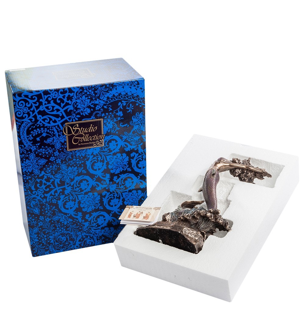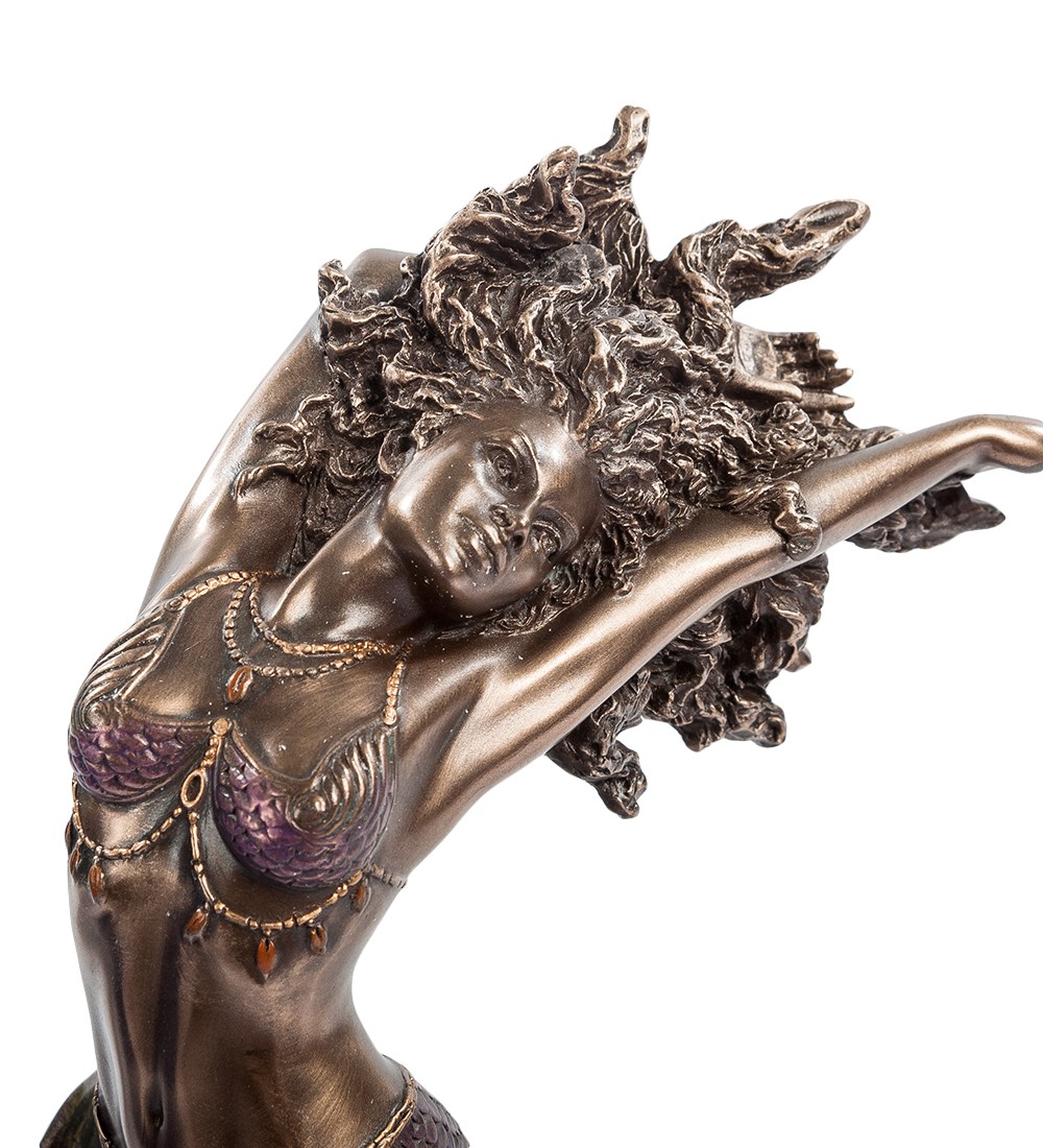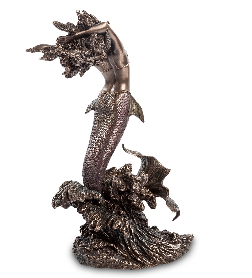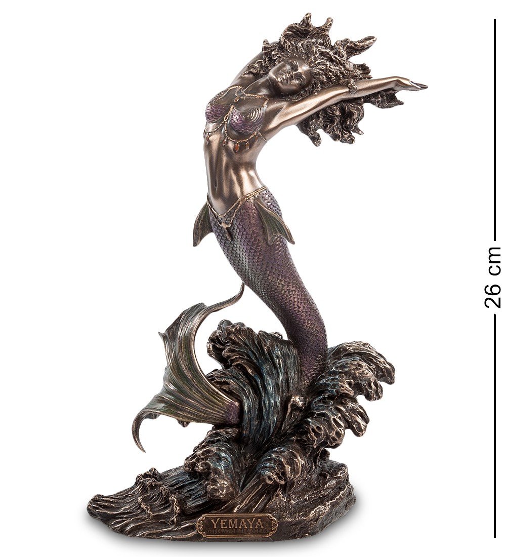 Богиня Йемайя - богиня моря, Великая Богиня Плодородия, покровительница женщин, появившаяся в мифологии йоруба (народность), а затем мигрировавшая во многие афроамериканские верования. Если вы собрали полную коллекцию египетских, древнегреческих и римских богов, но чувствуете, что чего-то в ней недостает, присмотритесь к фигурке «Богиня Йемайя – покровительница рожениц». На самом деле, Йемайя, жившая в мифологии йоруба, имеет больше отношений с морем, чем с роженицами, рожать в море и пользоваться покровительством Йемайи женщинам никто не мешает. Йемайя имеет хвост рыбы и живет в море, проще говоря, наша богиня – русалка. Статуэтка изображает настоящую красавицу, с прекрасным телом и очень привлекательным хвостом. Ее волосы вызывают восторг и трепет: наверное, в мире нет головного убора, которым их можно прикрыть, но Йемайе не требуются ни шляпы, ни зимние шапки. Тем не менее, об одежде ей известно: ее грудь прикрыта пляжным бюстгальтером с подвесками на цепочках, а на шее – золотой кулон. Йемайя плещется в морских волнах, подобно летающим рыбам, радуя нас красотой своего гибридного тела. Фигурка хороша сама по себе, ее можно дарить кому угодно. 26-сантиметровое изваяние из полистоуна украсит любую комнату, оформленную в классическом или старинном стиле.