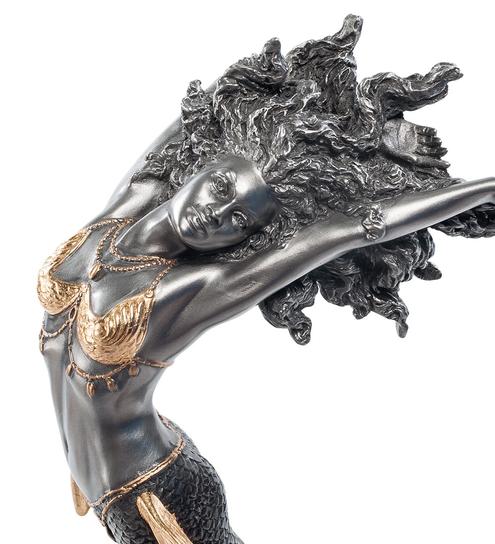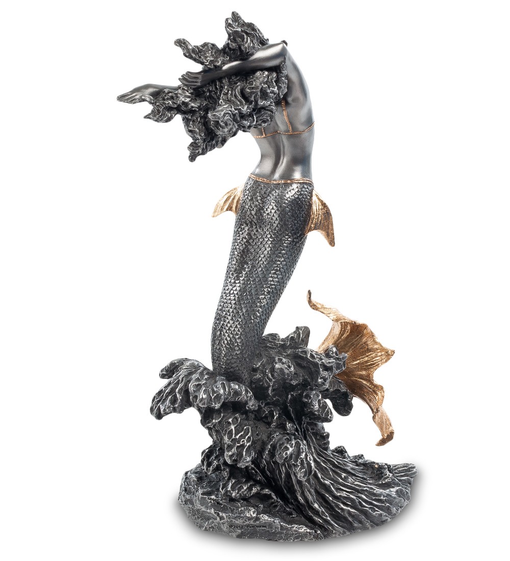 Богиня Йемайя - богиня моря, Великая Богиня Плодородия, покровительница женщин, появившаяся в мифологии йоруба (народность), а затем мигрировавшая во многие афроамериканские верования. На статуэтке «Богиня Йемайя – покровительница рожениц» Йемайя представлена в виде русалки, выныривающей из пучины. Она молода и привлекательна, а копне ее волос может позавидовать любая звезда Голливуда. В композиции ее плавники и кончик хвоста раскрашены в золотой цвет, как и бюстгальтер, которым прикрыл ее грудь скульптор. Рыбий хвост Йемайи очень аккуратен; создается впечатление, что он лишь покрывает женские ноги. Помимо покровительства над роженицами, Йемайя отвечает за плодородие и состояние морей на планете. Фигурка божественной русалки универсальна: она отлично смотрится и в домашней обстановке, и в офисе. Вручить Йемайю в качестве презента можно начальнику или начальнице, на юбилей или день рождения компании.