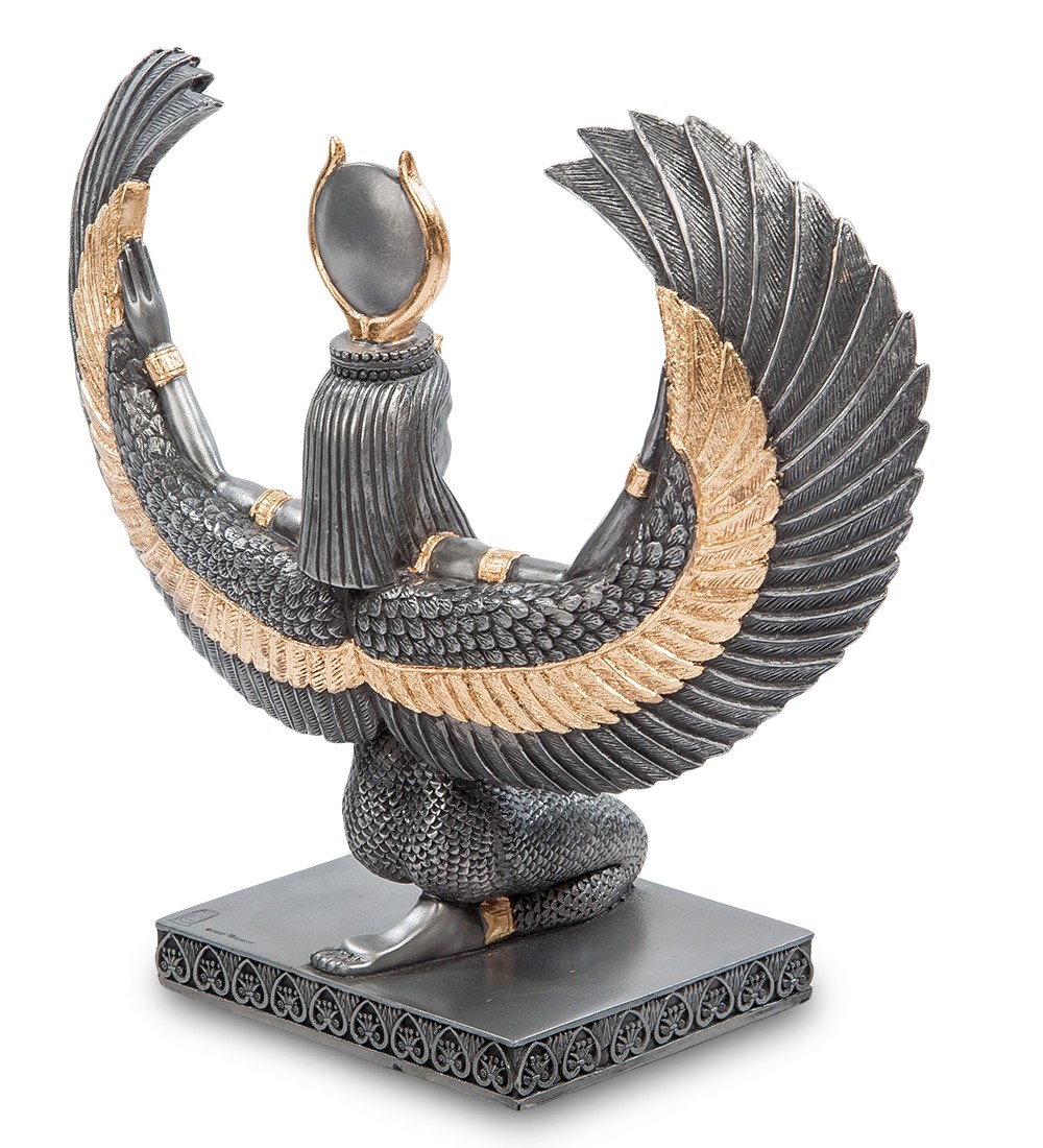 Исида (Изида) — одна из величайших богинь древности, богиня плодородия, воды и ветра, символ женственности, семейной верности. Исида – богиня материнства и плодородия – была одной из самых уважаемых богинь в легендах Древнего Египта. Помимо помощи в сельском хозяйстве и покровительства над матерями и детьми, она также умела управлять ветром и обладала редкой красотой. Фигурка из полистоуна «Исида – богиня материнства и плодородия» демонстрирует женщину в позе коленопреклонения; ее руки украшены большими крыльями, часть которых покрыта позолотой. Длинное, закрытое платье богини сделано из материала, напоминающего рыбью чешую, а головной убор поражает необычностью формы: на небольшой подставке находится блестящий круг в золотой оправе. Фигурка имеет темно-серый цвет графита; помимо золотистых крыльев, богиня носит золотые браслеты на руках и ногах. Ее головной убор также обильно украшен золотом. «Исида – богиня материнства и плодородия» будет хорошо смотреться не только в большой комнате жилого помещения, но и в офисе, обставленном в античном стиле, а также в приеме частной медицинской клиники.