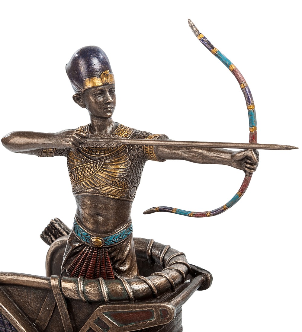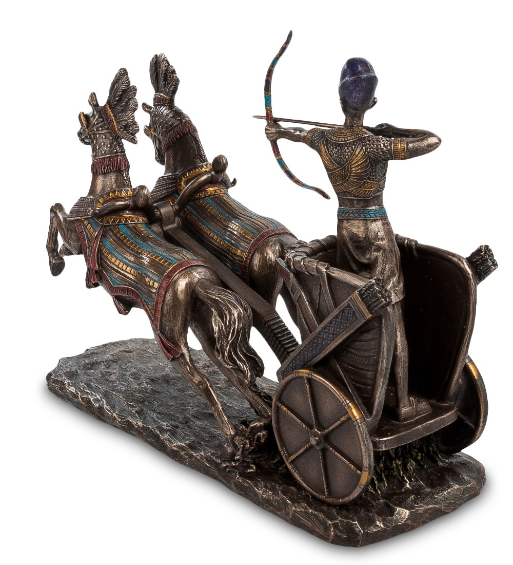 Рамзес (Рамсес) II Великий - один из величайших фараонов Древнего Египта, сын Сети I и царицы Туйи. Ему поклонялись, как богу. И он, в самом деле, обессмертил себя в сотнях грандиозных монументов, созданных за годы его правления. Скульптурная композиция «Рамзес II на колеснице» отсылает к реальным событиям далекого прошлого. Рамзес II – один из самых известных и почитаемых фараонов Древнего Египта. Во времена правления многие подданные считали его божеством, а властный фараон не только не опровергал эти слухи, но и поощрял, возводя монументы, изображавшие его в самых разных величественных ипостасях. Наша статуэтка изображает Рамзеса II в колеснице; фараон натянул тетиву лука и готовится поразить врага, а гарцующая пара лошадей подчеркивает торжество момента. Некоторые спросят, стоит ли тратить время и деньги на статуэтку, изображающую фантазии египетского фараона? Конечно да. Ведь без этих монументальных изваяний не было бы истории, и мы бы никогда не узнали, как жили далекие предки. Властные правители иногда полезны... как минимум, полезны историкам. Колесница Рамзеса подойдет как для украшения собственного жилья, обставленного в античном стиле, так и в качестве подарка военным, мечтающим о почете и славе.