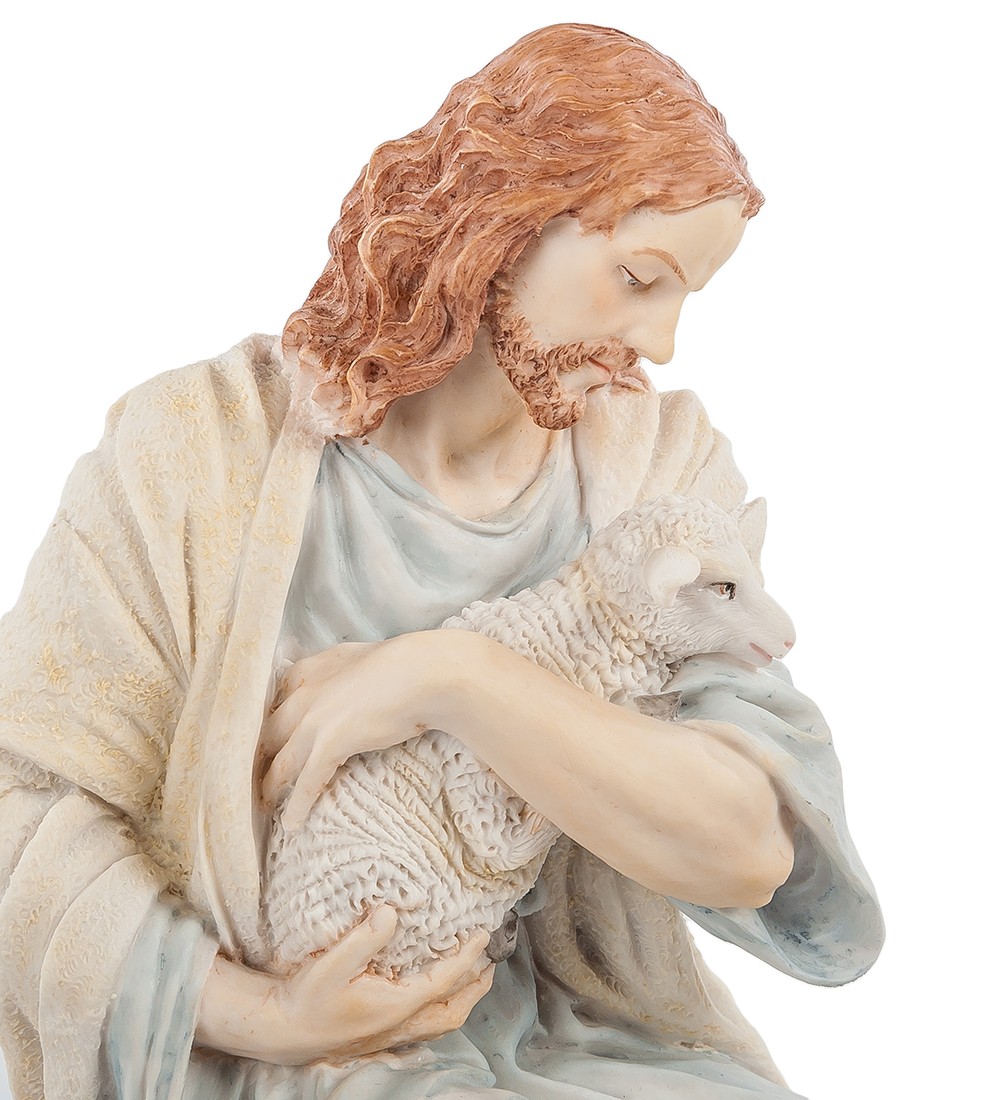 Особенная статуэтка «Иисус с ягненком» — одно из первых изображений Спасителя, о котором стало известно из Ветхого завета. Он выступает в роли «Доброго Пастыря», который с особенной любовью заботится о своих овцах. У Доброго пастыря всегда были чистые и искренние мотивы. Многие христиане полюбили такой образ Спасителя и изображали его в своих картинах и произведениях искусства. Фигурка Христа выполнена из полистоуна безупречно. Иисус выглядит, словно живой. Правильно подобраны оттенки у одежды, нанесены тёмные участки, каждая складочка удивительным образом выделена в соответствии с общей композицией. Некоторые художники изображают Сына Божьего в молодом возрасте с посохом. Статуэтка Иисуса с ягненком показывает взрослого мужчину, полного доброты, любви и мудрости ко всем людям и каждому человеку в отдельности. Подарить такую фигурку можно людям, которые верят в Господа, носят крестик и ходят в церковь. Они поймут всю суть происходящей сцены и будут ценить скульптуру наравне с иконописным видом Господа. Подарите себе или своим друзьям фигурку Иисуса и жизнь обязательно изменится в лучшую сторону.