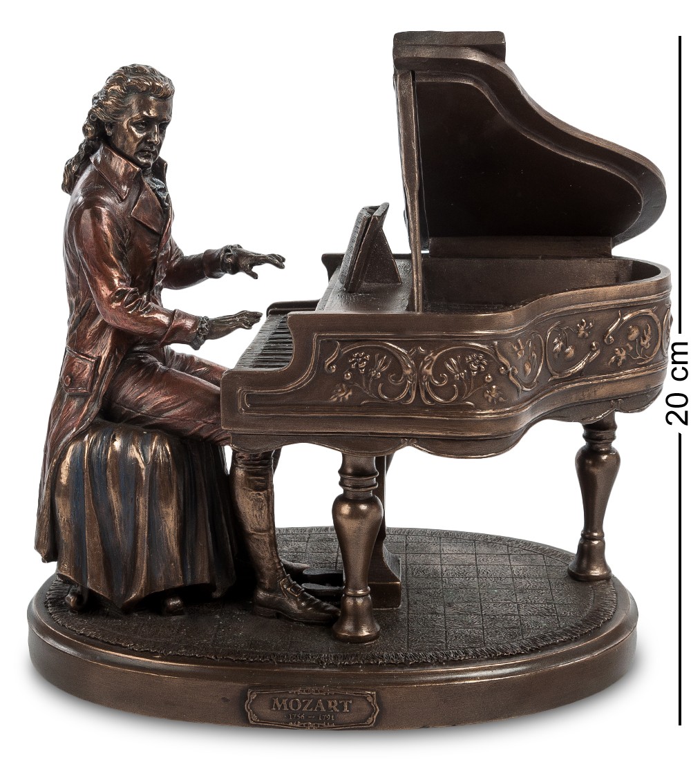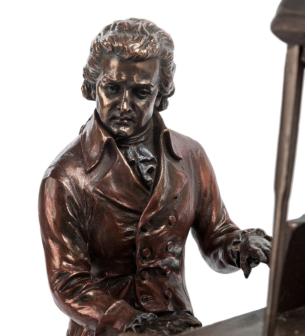 Вольфганг Амадей Моцарт - австрийский композитор, капельмейстер, пианист, скрипач, клавесинист, органист, представитель "венской классической школы". Его творчество — музыкальная вершина 18 в., детище эпохи Просвещения. Вольфганг Амадей Моцарт внес неоспоримый вклад в историю музыки и культуры в целом. Этот композитор, наделенный божественным талантом, подарил миру множество великих произведений, которые заставляют души людей трепетать в творческом экстазе. Статуэтка «Моцарт за роялем» воспевает талант бессмертного гения. Мастер решил воплотить образ Моцарт в самый важный и приятный момент его жизни: во время музицирования за роялем и создания очередных шедевров. Статуэтка «Моцарт за роялем», понравится как любителям музыки, так и ценителям изысканных вещей.