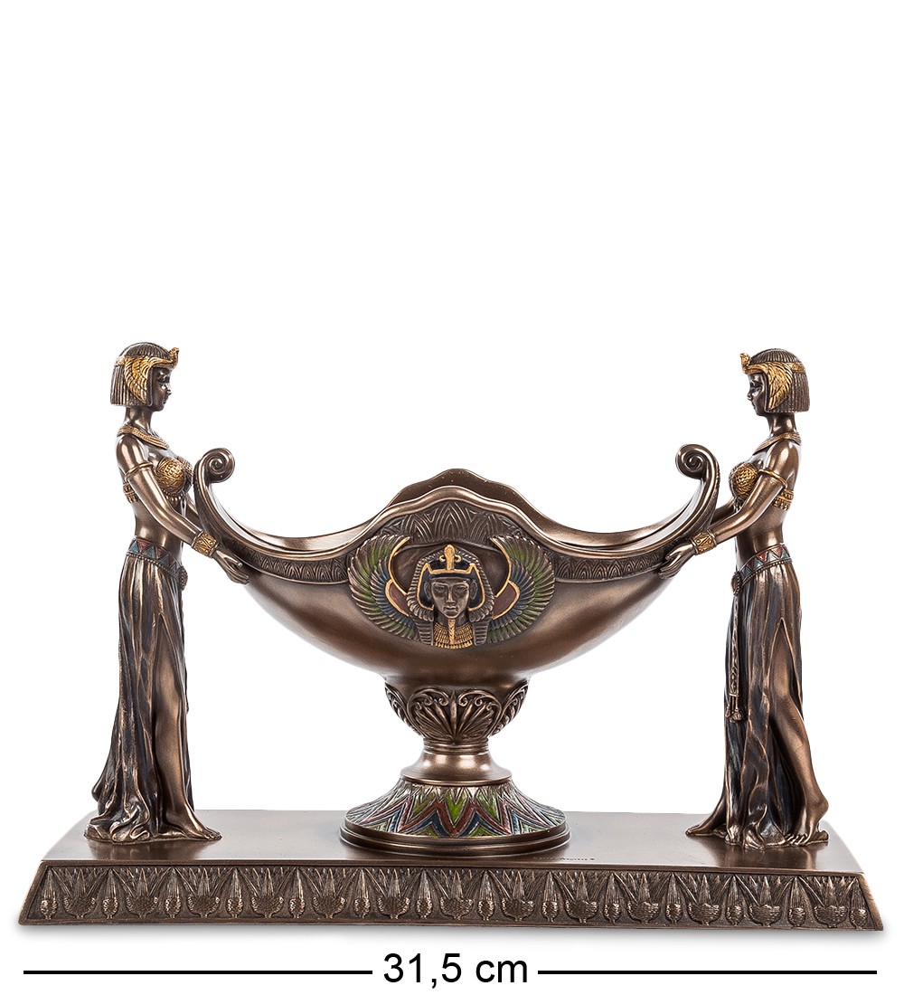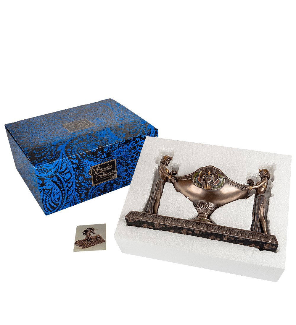 Стиль Арт Деко (Ар Деко, ар-деко, арт-деко) возник в начале двадцатого века. Представлял синтез модерна и неоклассицизма. Этот стиль отличает роскошь, дороговизна, шик, строгая закономерность, этнические геометрические узоры. В нем нашли отражение черты греко-римского классицизма, искусства древних государств - Вавилона, Древнего Египта, Ассирии, элементы культуры Ацтеков и Африканского дизайна. Ваза в стиле ар-деко «Египтянки» хорошо демонстрирует особенности стиля, который появился в начале XX-го века, снискал мировую известность и до сих пор сохраняет популярность в некоторых странах. Ваза выполнена в необычном, далеком от классики, стиле: у нее овальная форма, которая никак не подойдет для живых цветов, которые обычно ставят в эти декоративные сосуды. Ваза выполнена в виде купели для купания фараона: это подтверждает изображение верховного правителя Древнего Египта на стенке сосуда. По обе стороны от купели расположены стройные, молодые египтянки в одежде, популярной в период правления фараонов: на девушках длинные юбки, бюстгальтеры, вышитые золотыми нитками, и золотые головные уборы, выполненные в форме головы птицы и длинных крыльев. Ваза «Египтянки» - прекрасный подарок на юбилей. Ее также можно подарить деловому партнеру или чиновнику. Ваза будет прекрасно смотреться в богато обставленной комнате, на рояле, на каминной полке или на антикварном журнальном столике.