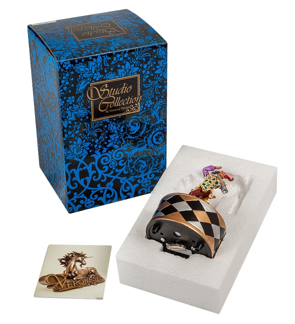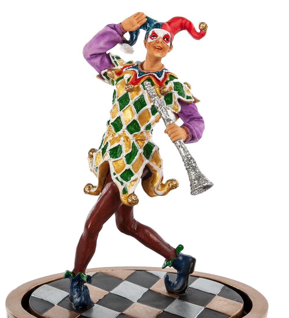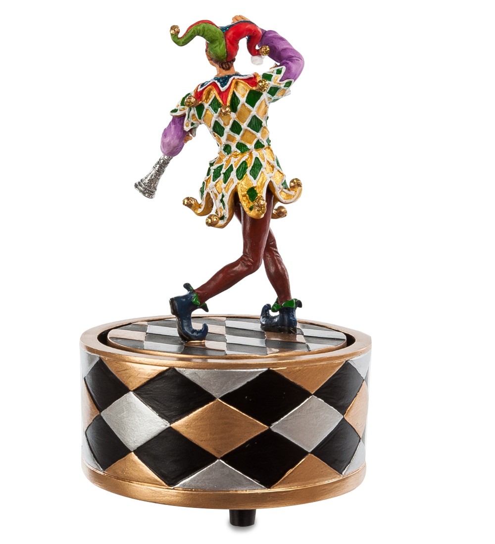 "Во все века во всех концах Земли карая слово дерзости любой шутам прощали правду короли: "Ну что ж, шути, мой шут, и шут с тобой!" Ю. Ряшенцев Во времена Средневековья шутов нанимали знатные вельможи, богатые аристократы, и короли для увеселения гостей. С помощью шутов высказывались самые смелые мысли, претензии и пожелания, не боясь наказания. Всегда наказывался шут, но его слова делали свое дело и доходили до умов, в адрес которых звучали шутки. Музыкальная фигурка шута задумывалась с целью поднять настроение владельцу необычного сувенира. Оригинальная идея автора расположить паяца на сцене в виде барабана, полностью передает атмосферу праздника и шутовства. Шут традиционно одет в яркую, разноцветную одежду, головной убор символизирует уши осла, лицо скрыто под маской, в руках держит музыкальный инструмент, на ногах шутовские ботинки с поднятым вверх носком. Всем видом музыкальная шкатулка излучает оптимизм и позитив. Лучшего подарка для поднятия настроения вам не найти, статуэтка шута понравится самым разным людям. С приобретением необычного сувенира ваш дом наполнится неповторимостью, радостью, улыбками и положительными эмоциями.