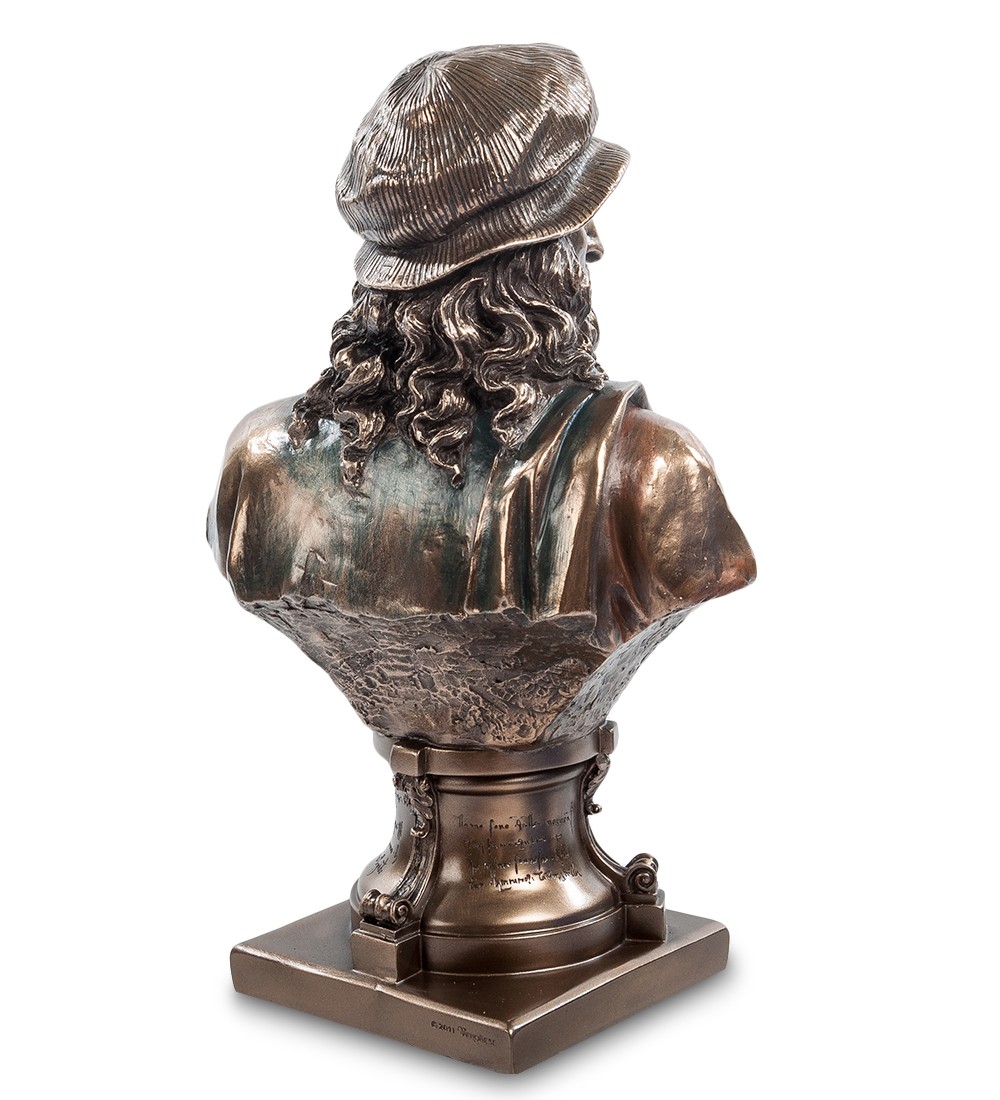 Леонардо да Винчи – итальянский художник эпохи возрождения, создавший большое число гениальных картин. Самые известные полотна – «Мона Лиза» (она же «Джоконда»), известная на весь мир своей загадочной улыбкой, а также тем, что ловит взгляд зрителя под любым углом просмотра картины, «Дама с горностаем», «Тайная вечеря» и т.д. Помимо создания гениальных полотен, Леонардо да Винчи преуспел в изобретательстве, инженерном деле, создал множество гениальных изваяний, а также медицинских работ, раскрывающих строение человеческого тела. Леонардо – признанный гений (вероятно, номер один в списке гениев, известных человечеству), «универсальный человек», имевший способности к любому делу, за какое бы ни доводилось браться. Статуэтка «Леонардо да Винчи» может быть подарена любому, кто пытается делать шаги в саморазвитии и развивать данные природой способности. Многие полагают, что образ Леонардо оказывает положительное влияние на эмоциональное состояние человека.