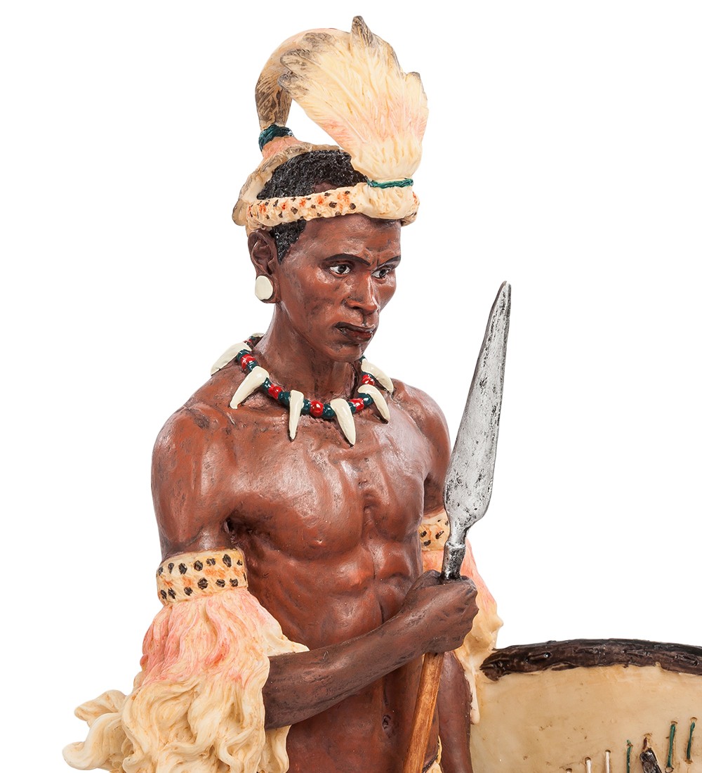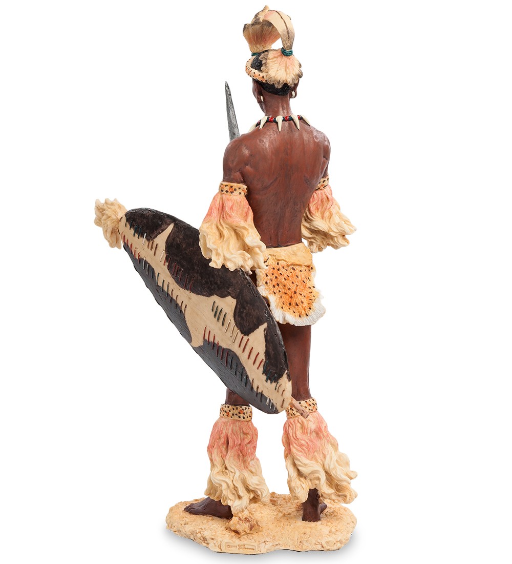 В Африке - жаркие пустыни и живописные горы, быстрые реки и удивительной красоты водопады, степи и джунгли, львы и носороги, хижины и небоскребы. Африка – это уникальный континент, где никогда не бывает слишком холодно и ничего не бывает слишком быстро. Контраст неторопливого стиля жизни далеких африканских селений, где мало что изменилось за тысячи лет, в сочетании с шумом и суетой гигантских современных мегаполисов, дают возможность почувствовать ритм самой истории. Экзотическая Африка находится слишком далеко, добраться туда непросто, а переехать и выживать, проводя год за годом – еще сложнее. Но все, кто бывал в Африке, утверждают, что это особый мир с особой, неповторимой красотой, и если есть возможность, Африку необходимо увидеть. Что делать тем, кто не может себе позволить путешествие в страну необычайных пустынь, гор, водопадов? Что делать тем, кто мечтает увидеть жизнь племен, которая не менялась тысячу лет? Наверное, смотреть фильмы и читать книги... или приобрести одну из наших статуэток, посвященных африканской культуре. Фигурка «Африканский воин» изображает солдата племени. В левой руке он держит легкий щит, в правой – короткое копье с металлическим наконечником. На ногах и руках – повязки с бахромой (скорее всего, это отличительные знаки, позволяющие отличать «своих» от «чужих»). На шее – ожерелье из клыков дикого животного, на голове – причудливый убор из тесьмы, перьев и банана. Кроме перечисленного, африканский воин носит набедренную повязку. Статуэтка воина может хорошо вписаться в этническую коллекцию статуэток. Ее можно дарить мужчинам на день рождения и 23-е февраля.