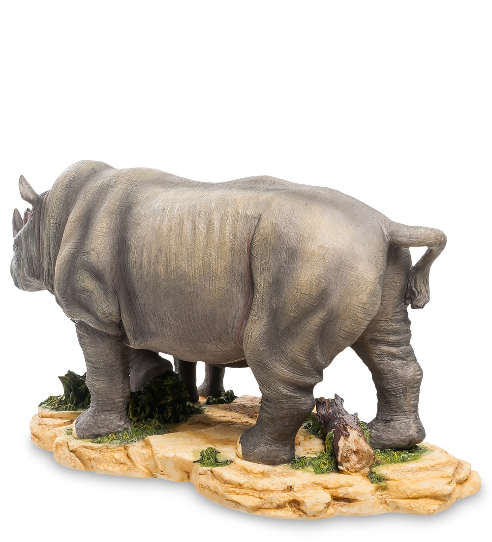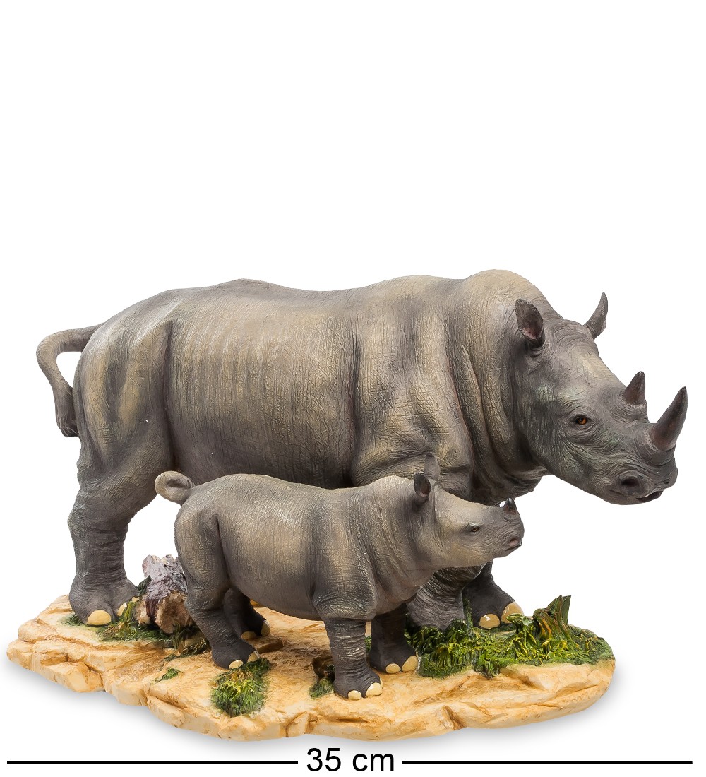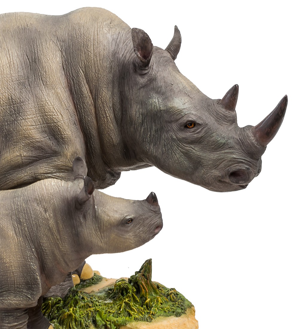 Статуэтка ''Носорог с детенышем'', высотой 17 см. Носорог почти мифическое животное. Некоторые до сих пор верят в магическую силу рога. Из-за него идет постоянное истребление этих животных. Рог имеет необычное строение: он образован не костным или роговым веществом, а тончайшими слоями кератина. Рог и копыта являются основным оружием носорога. Сейчас осталось только пять видов этого животного: яванский, черный, белый, суматранский и индийский. Раньше их было значительно больше. Сцены дикой природы не каждому из нас удается увидеть своими глазами. Кто-то может пойти в зоопарк, кто-то купить дорогой тур в Африку и устроить сафари, наблюдая за жизнью диких животных воочию. Но что делать, если на все это нет времени и средства не позволяют осуществлять путешествия по странам? Вы можете купить статуэтку носорога и поселить в своем доме кусочек саванны, который будет дарить вам хорошее настроение и улыбку. Трогательная сцена матери носорога и малыша является отличным примером того, как в дикой природе заботятся о своем подрастающем потомстве и насколько важно всегда помнить о том, что несмотря ни на какие проблемы, семья и семейные узы всегда остаются наиболее крепкими и прочными.