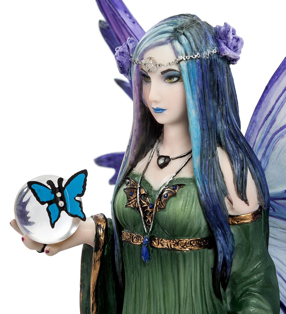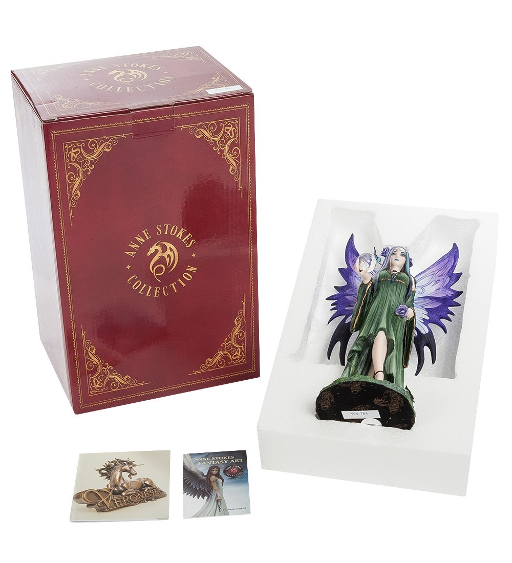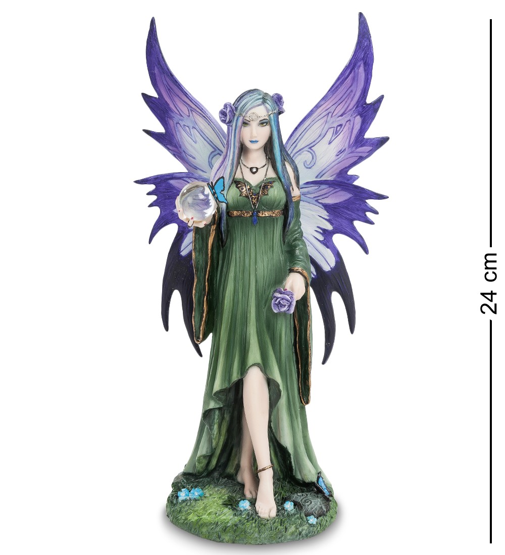 Колдунья, ведущая свой род от древних славянских богов – это не крылья у нее сзади, а темное пламя мистической ауры. Связь с природой – нерушима: стоит босиком на траве, с которой как бы сливается длинное зеленое платье, вокруг цветы и даже камни под ногами узорчатые. В одной руке – невероятный синий цветок, а в другой – волшебная прозрачная сфера. Взгляд – строгий и даже суровый – ох, не с добром она появилась, лесная волшебница. Или кто-то ее мир зеленой природы потревожил? А, может, она вас самих охранять будет и станет на страже колдовских сил? Красивая и завораживающая статуэтка.