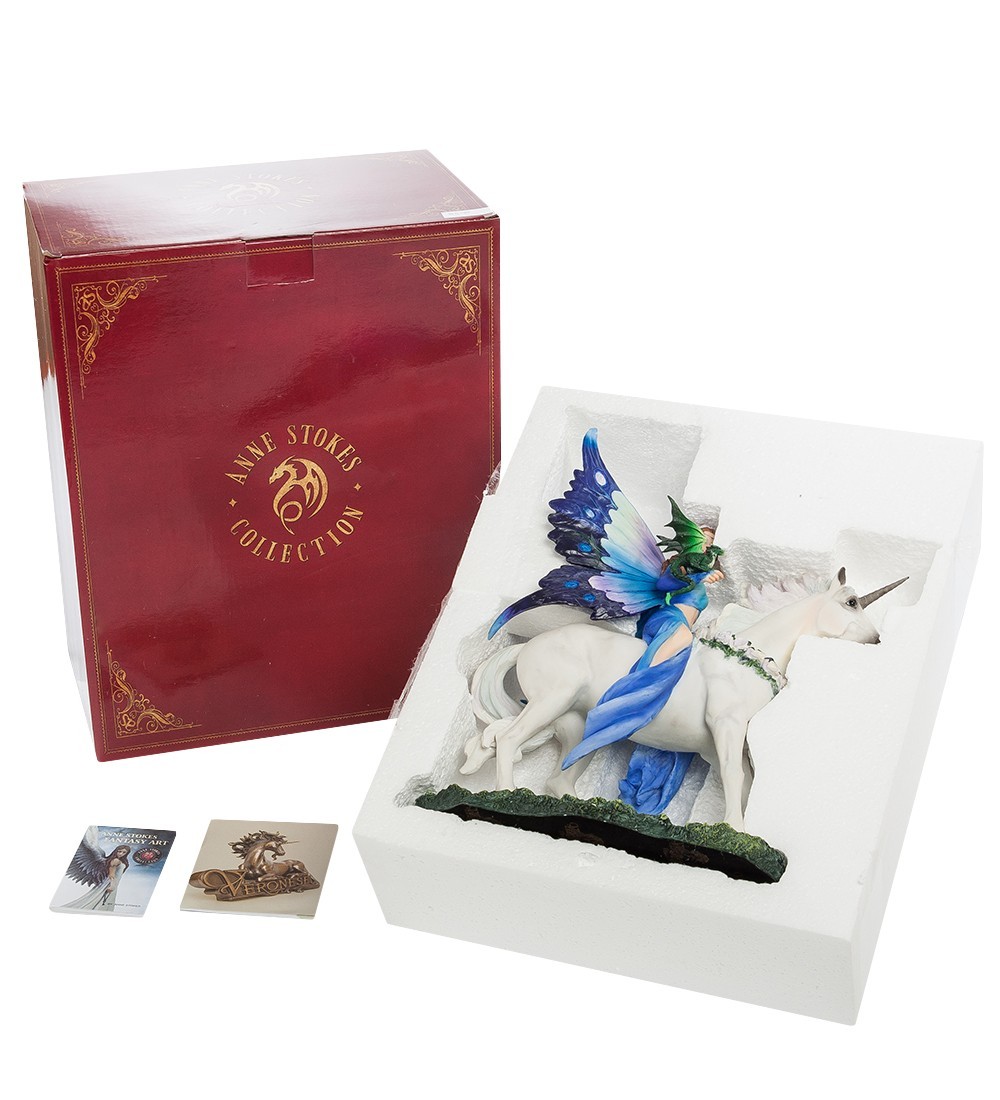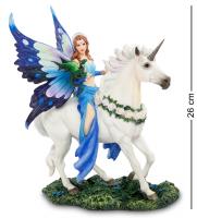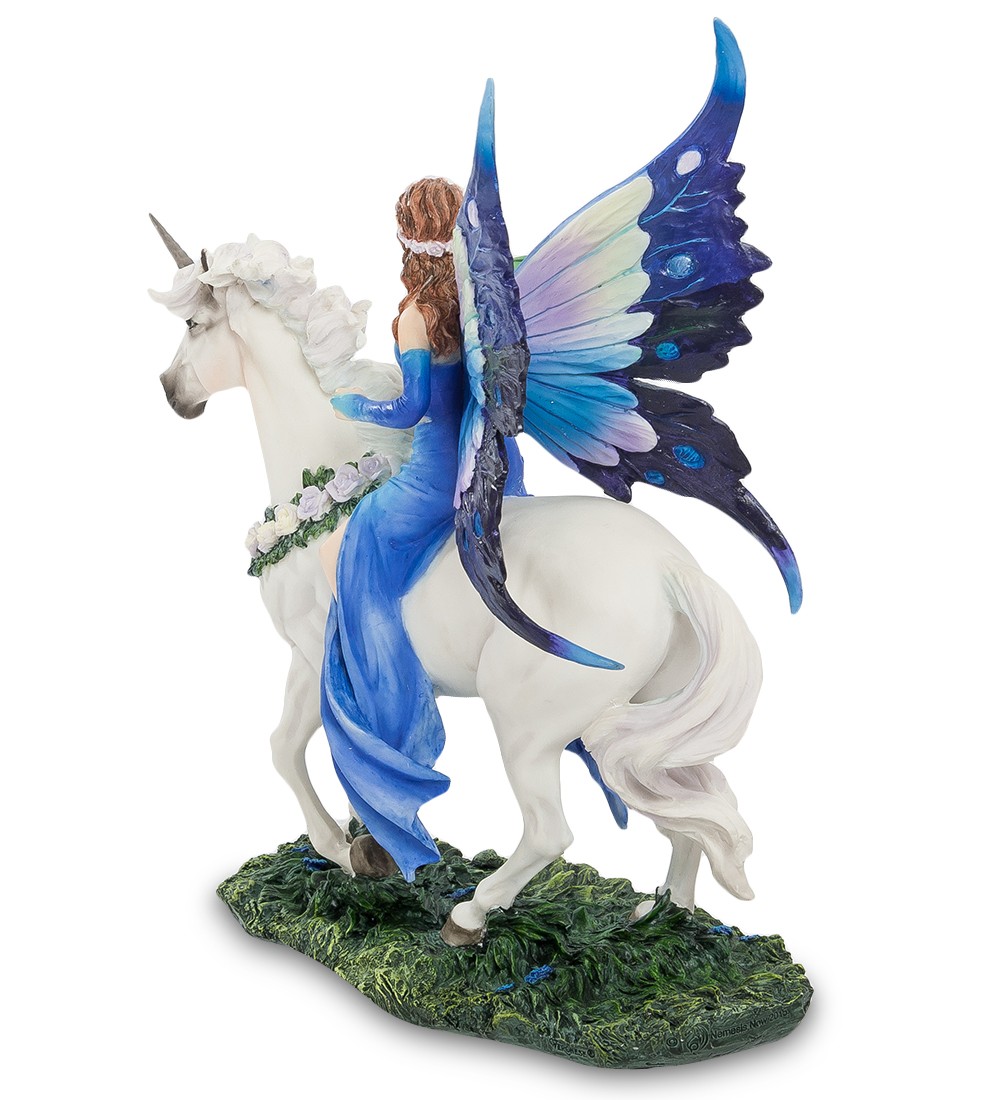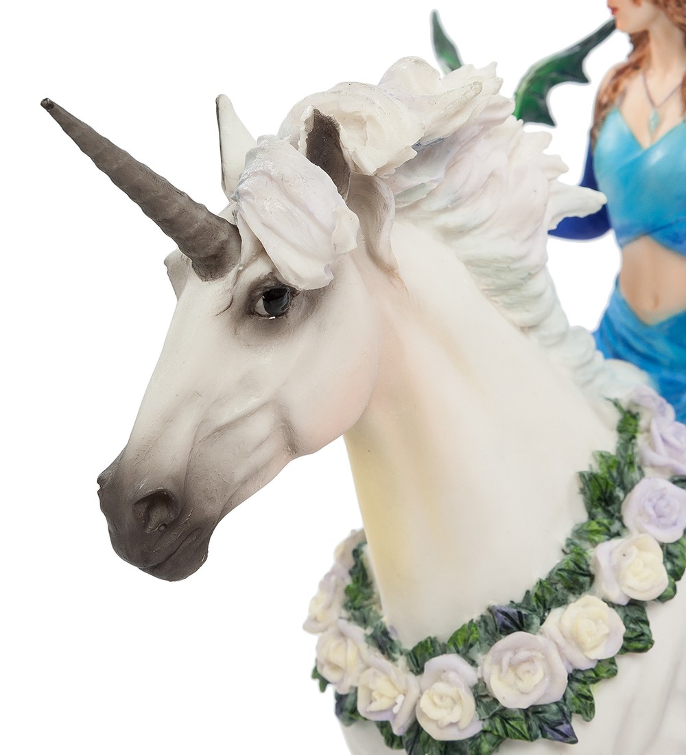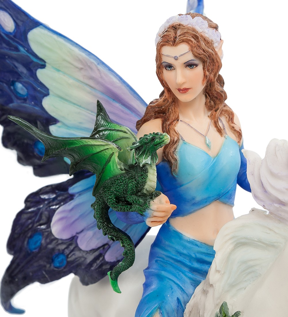 Вряд ли кто-то сомневается, что магия – удел избранных и необычных людей. А может быть вовсе и не людей, а существ, которые живут в параллельных мирах и лишь изредка дают себя узреть мистикам и писателям-фантастам. Вероятно, Энн Стоукс повезло, и она создала целый цикл художественных работ, посвященных существам с магическими способностями. Статуэтка «Королева магии» изображает одно из них. Молодая, привлекательная девушка восседает на белом единороге, украшенном белыми розами. На ее левой руке примостился небольшой зеленый дракон, а вместо легких крыльев феи Королеве магии достались огромные крылья бабочки, ярко раскрашенных в синие тона. Наряд Королевы подобран в тон крыльям, а несколько изысканных ювелирных украшений завершают образ. Подарок тронет сердце многих любителей фэнтези... сделайте приятное кому-нибудь из друзей, и со временем Королева магии обязательно исполнит одно из ваших желаний.