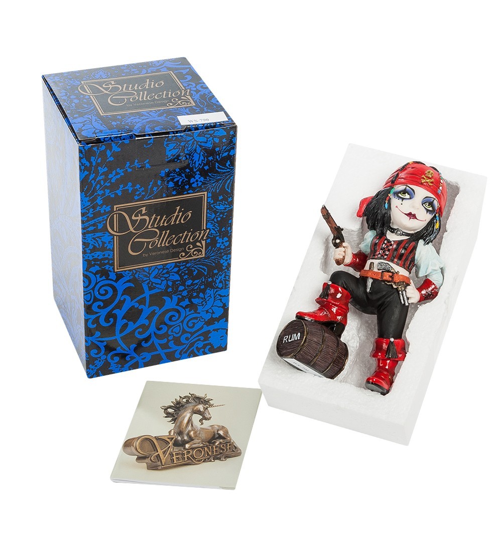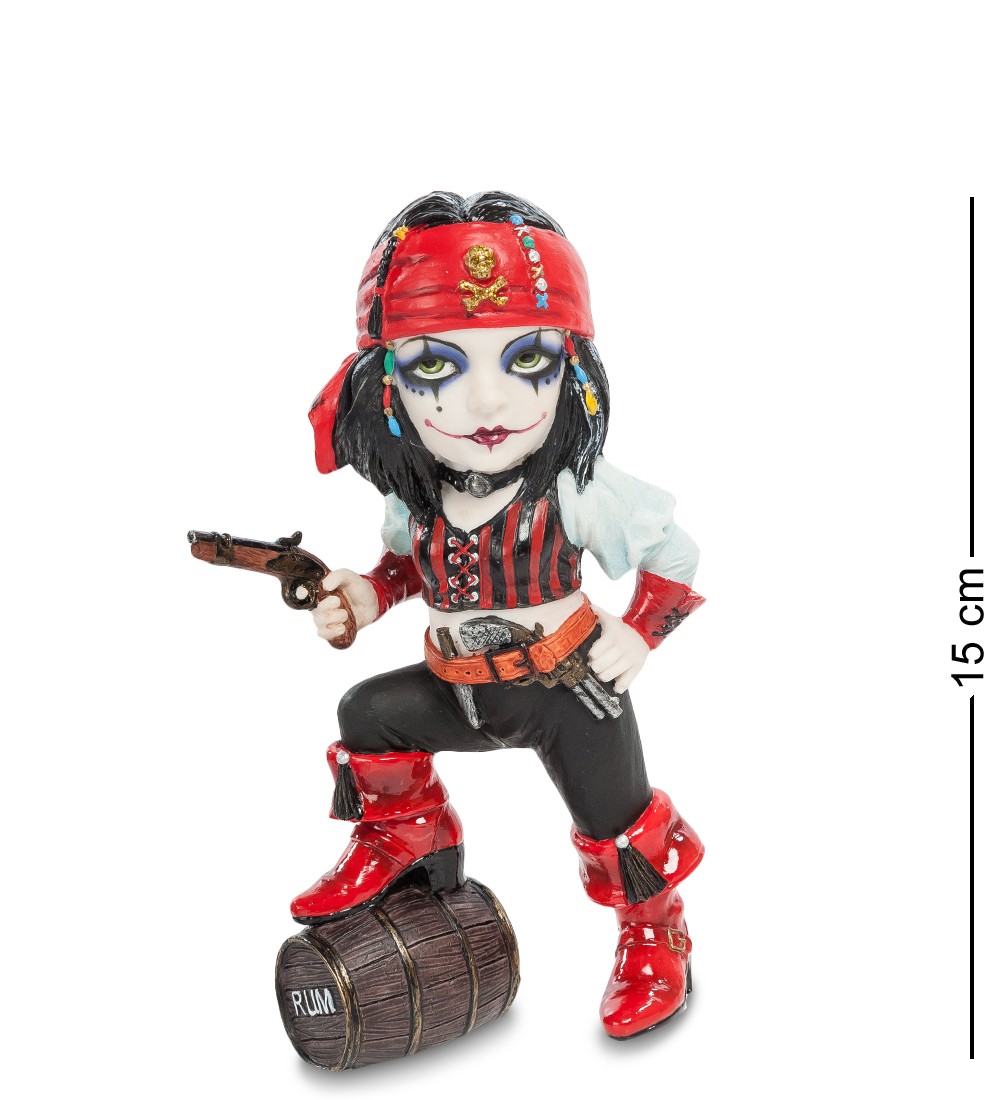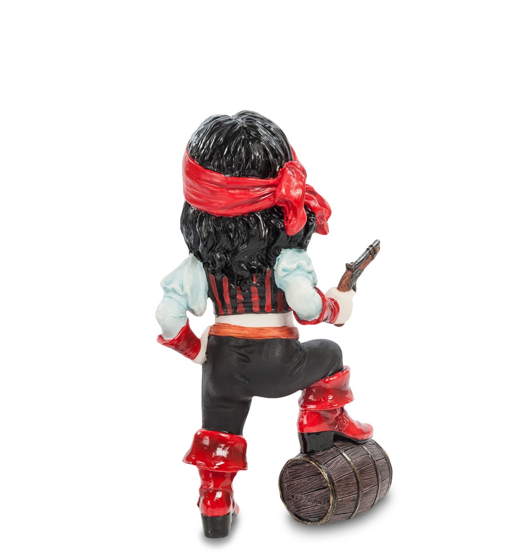 «Маленькая пиратка», защищающая бочку рома при помощи старинных пистолетов – приятная статуэтка среднего размера, сделанная со вкусом и любовью. Судя по лицу, мастер создавал ее с натуры, настолько реалистичны и пропорциональны черты лица юной дамы. Пиратка и вправду маленького роста, зато, как многие низкорослые женщины, отличается уверенностью в себе и боевитостью. Черно-красная цветовая гамма выбрана художником весьма эффектно: она подчеркивает остроту момента и внутреннее напряжение, в котором обычно пребывают морские разбойники. «Маленькую пиратку» можно смело дарить детям среднего возраста, мечтающим о приключениях и путешествиях. Дети, не имеющие друзей, также обрадуются реалистичному и полному жизни подарку, а современные девушки, идущие по жизни без посторонней помощи, моментально узнают в ней себя.
