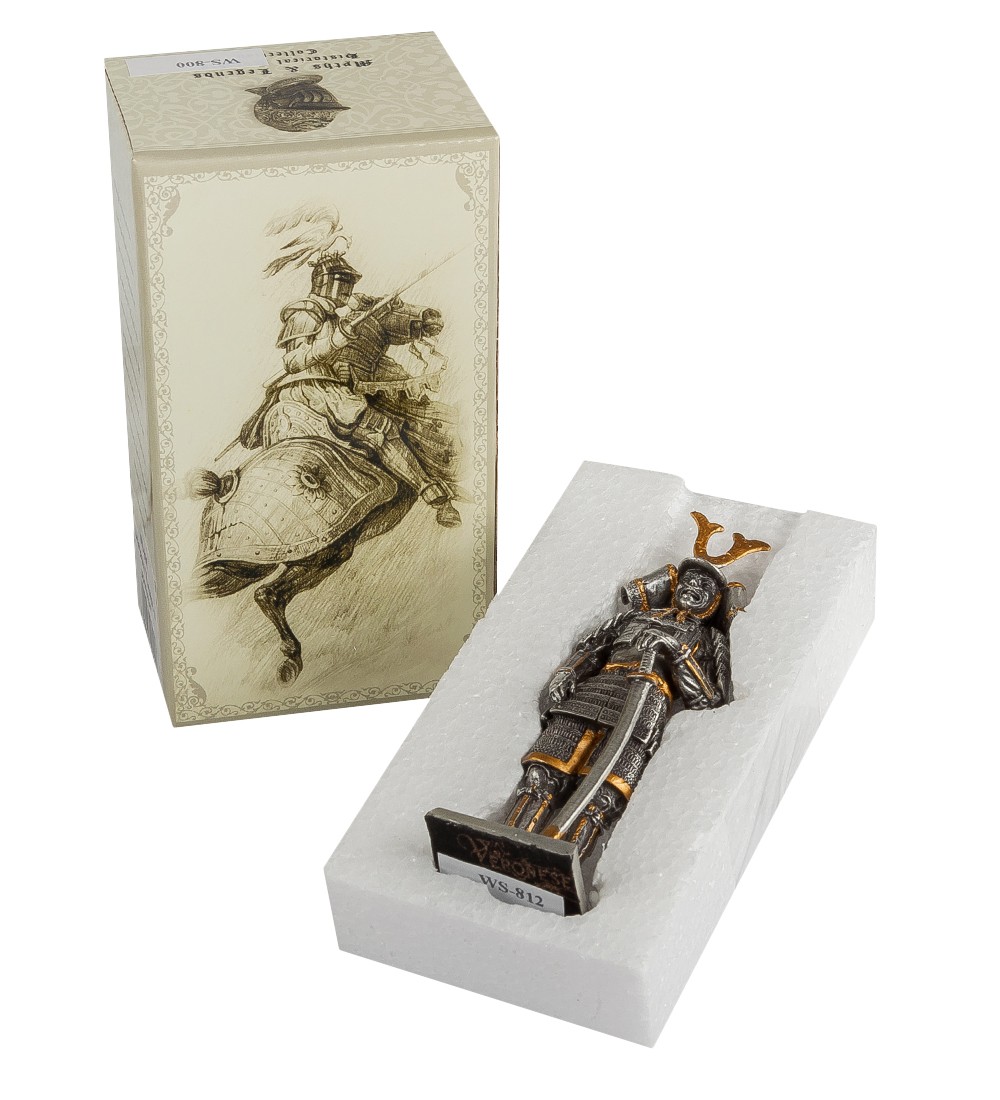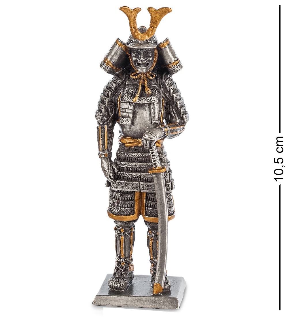 Статуэтка ''Сёгун Асикага Такаудзи'', высотой 10,5 см. Асикага Такаудзи — основатель и первый сёгун сёгуната Муромати. Правил с 1338 по 1358 годы. "В битве преданность самурая выражается в том, чтобы без испуга идти на копья и стрелы врага, навстречу смерти, если таков зов долга." «Начальные основы воинского мастерства» Дайдодзи Юдзана Востоковеды, знающие историю Японии, подтвердят, что в стране Восходящего солнца почти все прошлое тысячелетие правил не император, а правительство сёгунов - военных генералов, объединявшихся в кланы и часто сменявших друг друга на верховных постах. Асикага Такаудзи – правитель Японии в середине 14-го века, а также основатель и первый сёгун гёгуната Муромати, один из участников свержения Камакурского правительства, а также активный участник за восстановление в стране «прямого императорского правления». Статуэтка «Сёгун Асикага Такаудзи» изображает легендарного военного в полном обмундировании, которое немного напоминает наряд средневековых рыцарей, живших в Европе в те же годы. На голове Такаудзи железный шлем с козырьком, украшенный декоративными позолоченными рогами, на теле, руках и ногах – железные доспехи, также украшенные золотом, а под ладонью левой руки – рукоятка длинного самурайского меча, спрятанного в ножнах. Японского средневекового правителя можно подарить другу, интересующемуся историей азиатских стран, или же украсить фигуркой одну из собственных комнат, оформленных в старинном стиле.