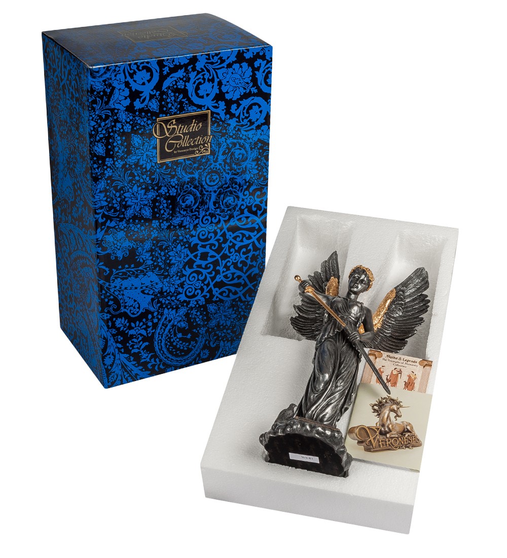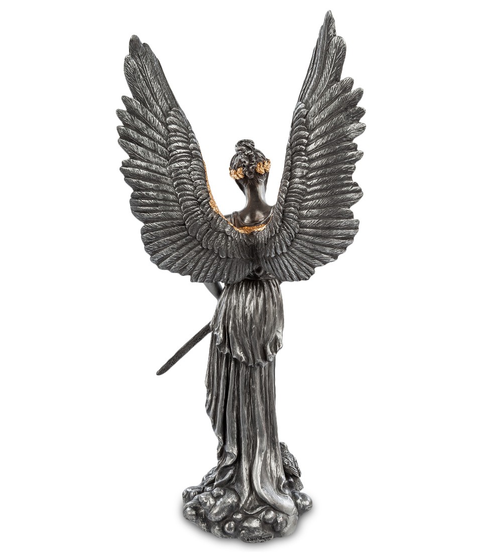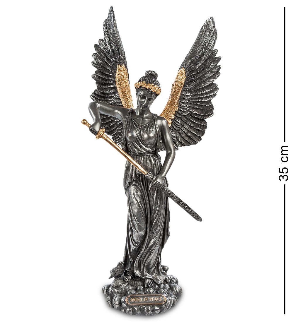 Ангел Мира убирает меч в ножны, тем самым призывая к прекращению всех конфликтов и войн. Хотя человечество исторически раздирают войны, и на карте мира нет стран, которым удалось остаться в стороне от кровавых столкновений, люди стремятся к мирной жизни – залогу прогресса и процветания. Статуэтка «Ангел мира» изображает женщину, напоминающую древнегреческую богиню победы Нику: у нее большие крылья, а на голове – лавровый венок, являющийся символом победы. Возможно, лавровый венок на голове ангела изображен как напоминание простой истины, что лучший способ победить в войне – не участвовать в ней. На девушке длинное античное платье, а в руках – золотой меч, который она прячет в ножны. Фигурка сделана из полистоуна цвета графита, ее высота – 35 сантиметров. Фигурку «Ангел мира» можно поставить в кабинет, если вы хотите произвести впечатление рационально мыслящего, разумного человека. Статуэтку также можно подарить конфликтному другу.