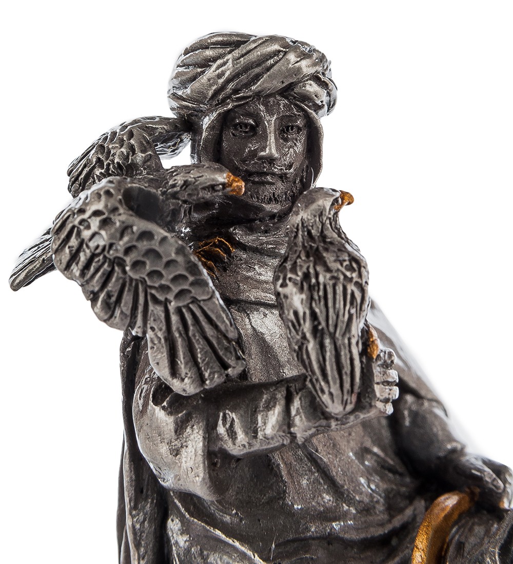 Статуэтка ''Охотник воин с соколом'', высотой 9,5 см. Соколиная охота известна с глубокой древности. Самые ранние документальные свидетельства были обнаружены при раскопках ассирийской крепости Дур-Шаррукин, вотчины царя Саргона II (722-705 гг до наш эры). Еще до нашей эры охота с использованием птиц семейства соколиных была известна у монгольских кочевников, китайских императоров, на Корейском полуострове, в Индокитае, Персии и на Ближнем Востоке. В европе она оставалась неизвестной до III века. На территории России соколиная охота стала популярной где-то в VIII-IX веках. Соколиная охота появилась настолько давно, что выяснить более-менее точную дату историкам пока не удалось. Первые свидетельства приручения хищных птиц человеком и использования их в охоте датируются седьмым веком до нашей эры: их обнаружили археологи во время раскопок крепости ассирийского царя Саргона. Охота при содействии соколов была популярна Персии и Индокитае, на Ближнем Востоке и даже в России, где соколов стали эксплуатировать в охотничьих целях с IX-го века. Интерес к соколиной охоте стал падать после изобретения огнестрельного оружия, но даже сейчас, когда изменился сам подход человека к добыванию пищи, охота с птицами до сих пор популярна о отдельных энтузиастов. Статуэтка «Охотник воин с соколом» сделана из полистоуна, и имеет высоту 9.5 сантиметров. Охотник-воин изображен верхом на лошади, украшенной золотой сбруей. Строго говоря, в охоте принимает участие не одна, а целых две птицы: первый сокол сидит на плече воина, второй – на кисти левой руки. Фигурка отлично смотрится; ей можно украсить домашний кабинет или библиотеку, а также подарить по случаю другу-охотнику.