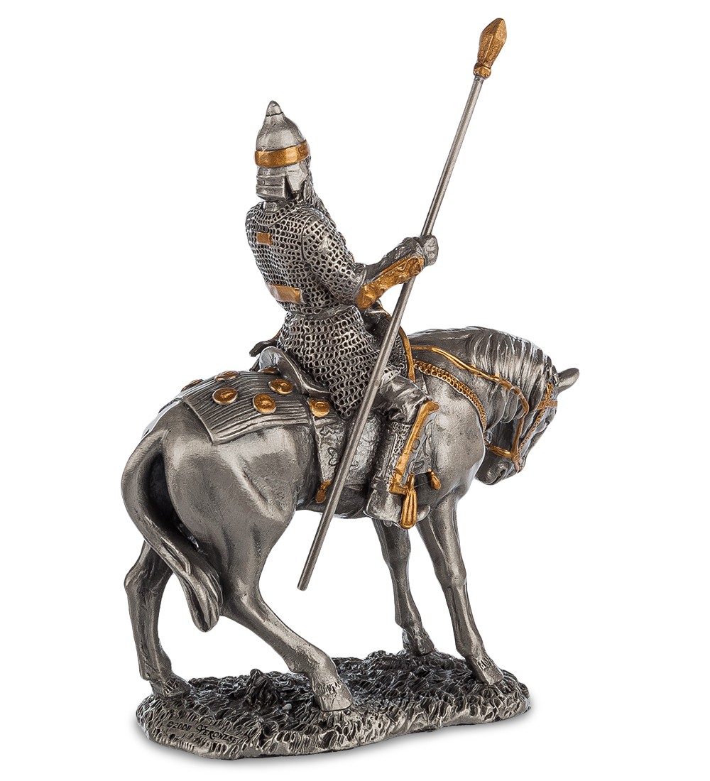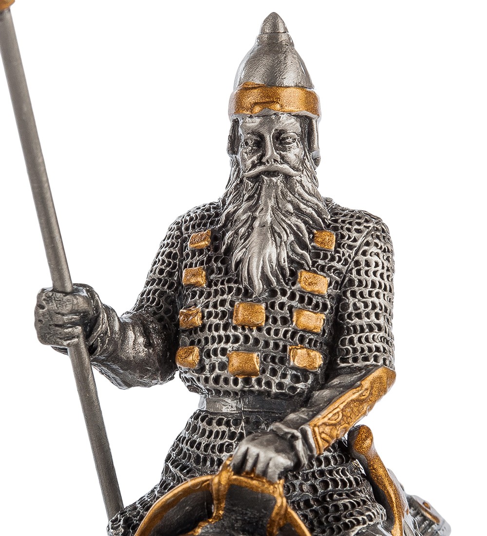 Статуэтка ''Воин на коне'', высотой 10,0 см. "...Мы с детства меч приучены держать, Коней ретивых нас пленяет стать, И битвы звон и барабанов звуки И ран тяжелых опьяняют муки…" Дмитрий Яковлев Изучившие раздел наверняка видели статуэтки, изображающие конных рыцарей, индейцев и китайских наездников. Статуэтка «Воин на коне», предлагаемая на этой странице, изображает славянского воина – настоящего русского богатыря, вооруженного длинным копьем и острым мечом. Как и все богатыри, наш передвигается верхом на крупной лошади, украшенной красивой попоной и золотой сбруей. Несмотря на немалый вес амуниции, наездник прочно держится в седле: удержаться ему помогают золотые стремена и ручка в центре седла. На голове богатыря – классический русский шлем, имеющий форму конуса, на теле – кольчуга из крупных металлических колец. Как и все мужчины, жившие в допетровскую эпоху, богатырь не бреет пышную бороду, которая закрывает всю его могучую грудь. Фигурка «Воин на коне» понравится любителю русских народных сказок, наезднику-любителю и профессиональному военному. Лучшее место для русского богатыря из темно-серого полистоуна, которое можно подобрать в квартире – кабинет или библиотека.