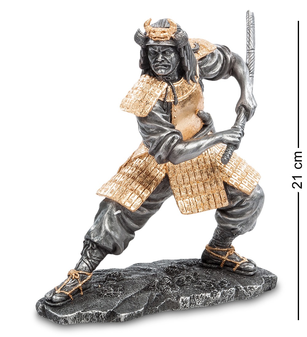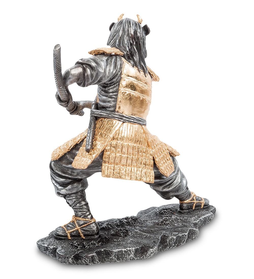 Самураи - светские феодалы и древней Японии, являлись телохранителями своего сюзерена (феодального правителя), и в то же время его слугами в повседневной жизни. Кодекс поведения самурая «Бусидо» был проникнут духом беспрекословного подчинения господину и презрения к смерти. Все слышали о японских воинах, история существования которых состоит из множества необычных фактов, побед и сражений. Обычно при слове «самурай» мы вспоминаем длинный, дугообразный меч, острота которого вошла в легенду: некоторые из старинных самурайских мечей, изготовлением которых занимались потомственные мастера, были способны разрубить на лету насекомое. Статуэтка «Самурай», имеющая высоту 21 сантиметр и сделанная из темно-серого полистоуна, изображает японского воина, традиционно вооруженного мечом, и защищенного легкой броней, украшенной яркой позолотой. Поверх старинных носков самурай носит легкие сандалии; его тело ниже пояса прикрыто позолоченными пластинами. Такие же пластины прикрывают его плечи, а грудь и шею защищает металлический лист. На старинном шлеме самурая изображена голова быка с небольшими рогами. Воин встал в боевую стойку, на его лице - свирепое выражение, и через мгновение острый меч покинет ножны. «Самурая» можно подарить другу, владеющему восточными боевыми искусствами. Фигурку также можно поставить в комнату, в которой уже имеются восточные статуэтки и украшения.