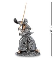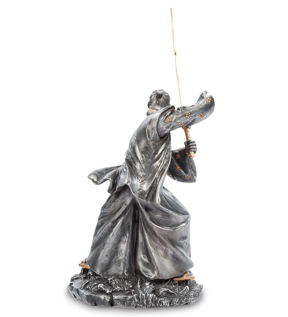 Самураи - светские феодалы и древней Японии, являлись телохранителями своего сюзерена (феодального правителя), и в то же время его слугами в повседневной жизни. Кодекс поведения самурая «Бусидо» был проникнут духом беспрекословного подчинения господину и презрения к смерти. Культура самураев – одна из самых древних действующих боевых культур на планете. О восточных воинах, вооруженных острыми как бритва мечами, снято множество фильмов. За последние пару столетий положение самураев в иерархии менялось по мере изменения социального уклада жизни в Японии, но образ героя, готового пожертвовать жизнью в сражении, не стерся из памяти. Если вам импонируют традиции страны Восходящего солнца, фигурка «Самурай с мечом», сделанная из серого полистоуна, вам тоже наверняка понравится. Самурай изображен в боевой стойке; его ноги расставлены в стороны, а колени широко раздвинуты. В этом положении он может сохранять устойчивость и наносить точные, своевременные удары. Острый позолоченный меч на длинной ручке самурай держит двумя руками, подняв над головой. Воин одет в длинное свободное кимоно, широкие рукава которого украшены золотыми цветами. Золотом также покрыты сандалии на деревянной подошве и атласный шарф. Статуэтка «Самурай с мечом» будет более чем уместно смотреться в квартире военного или спортсмена, увлекающегося восточными боевыми искусствами.