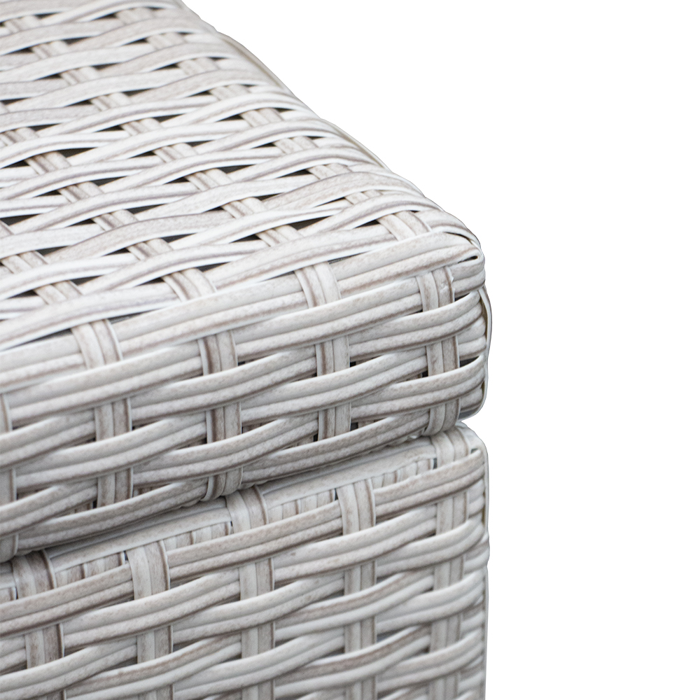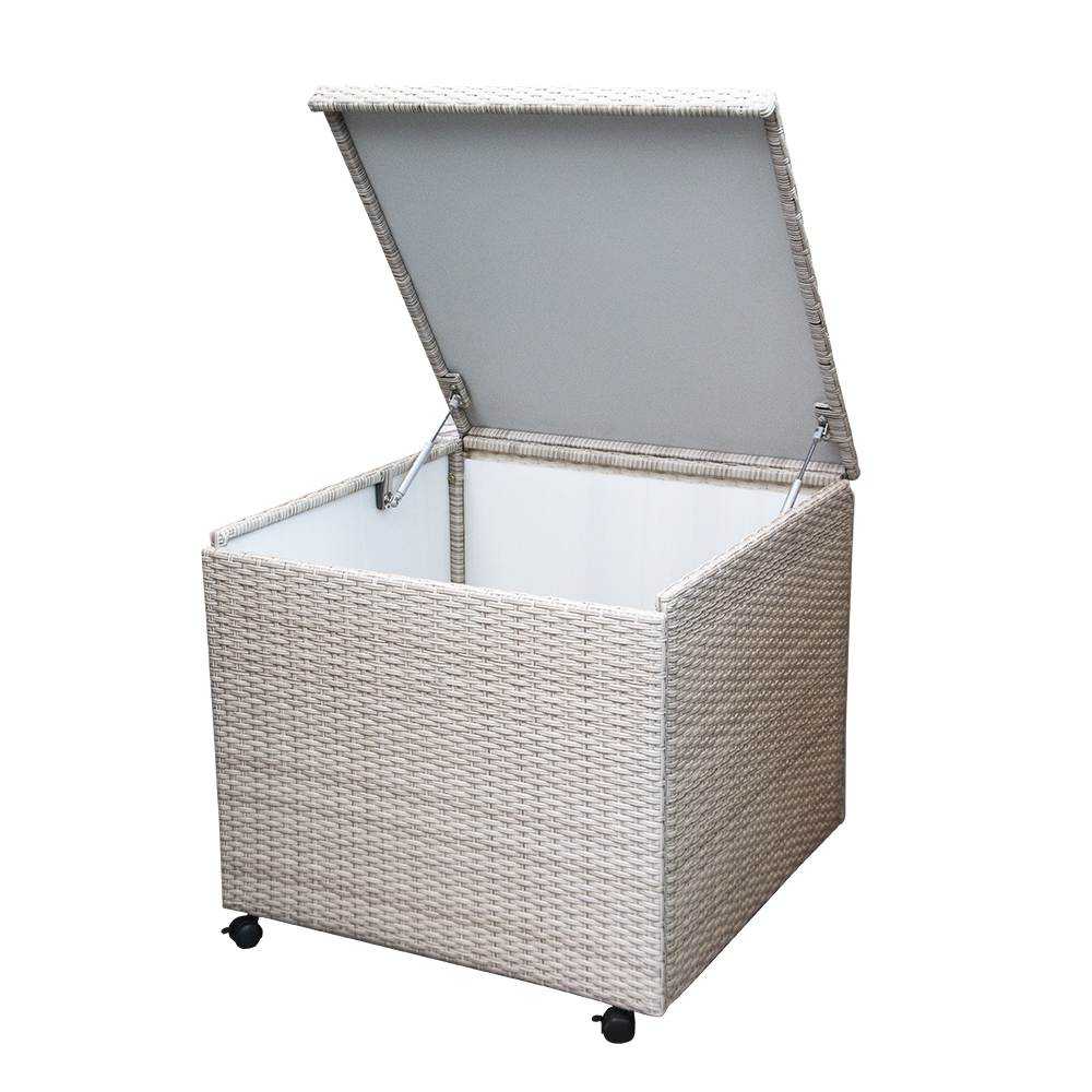 Короб из техноротанга для хранения вещей, пледов, подушек и различного рода садовой утвари. Оборудован колесиками для комфортного перемещения и газлифтом крышки.